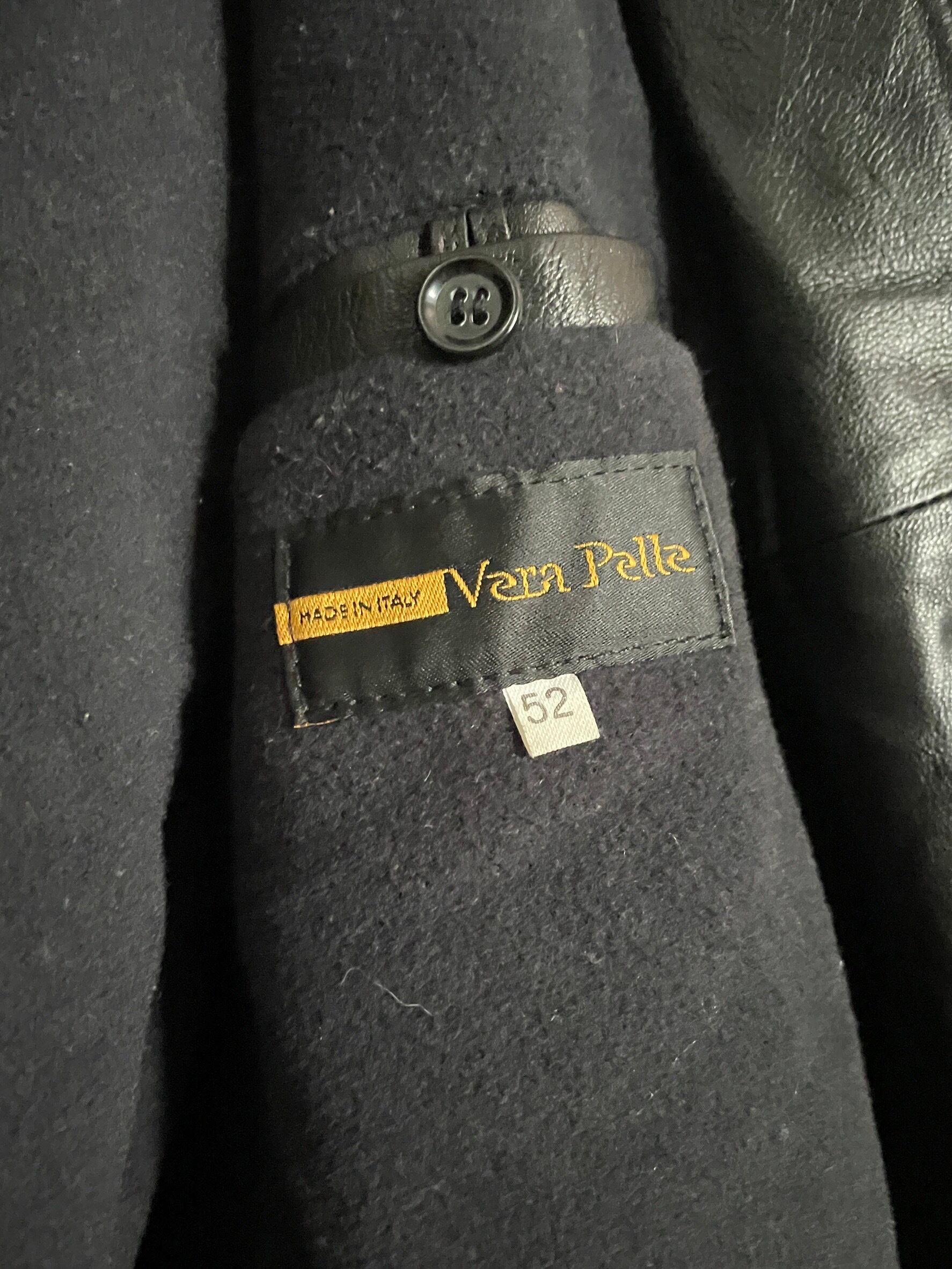高級感のあるブラックレザーダッフルコート。文句無しでかっこいいディテールになってます。普通のダッフルコートとはまた違った雰囲気の出せる一着。モチっとした質の良いレザー。裏地はフワッっとしたフリースのような質感になってます。程良い丈感でゆったりとした綺麗なシルエット。さすがイタリア製です。どんなアイテムと合わせても様になるお洒落な一着です。
