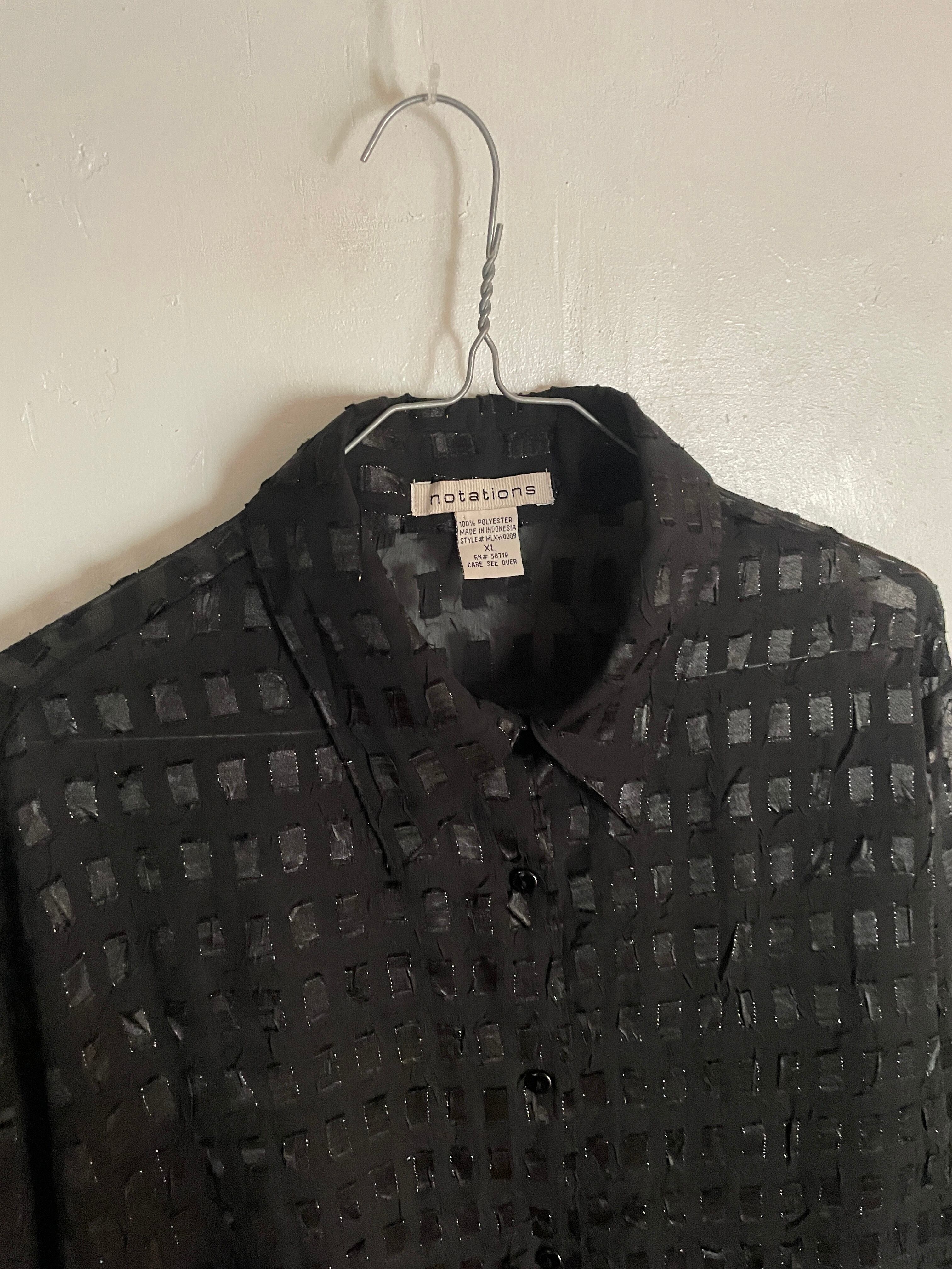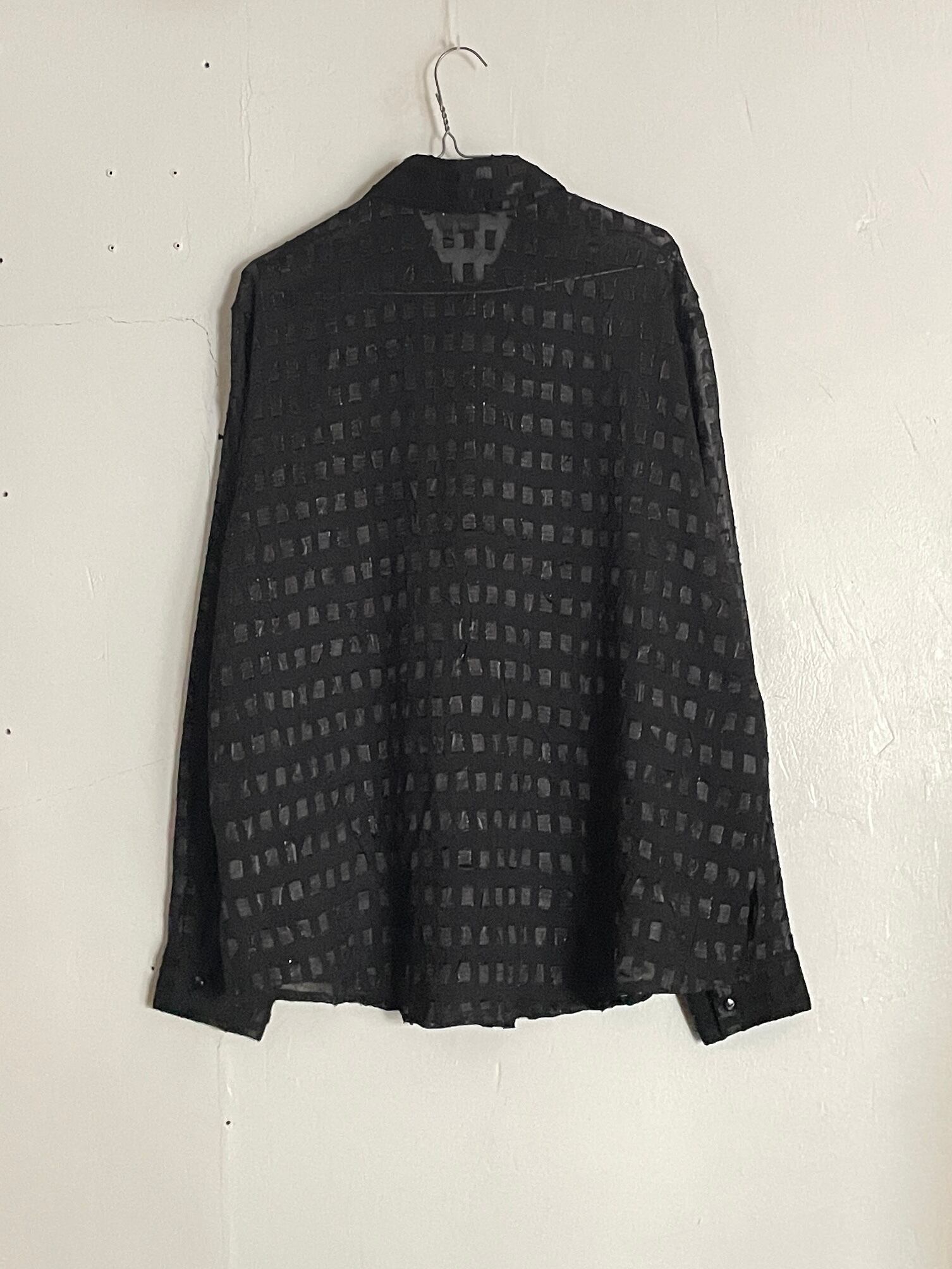 透け感のあるブラックボディに、ボックス型のキラッとした布が貼り付けられた、シースルーシャツ。モードな雰囲気のあるお洒落なデザインです。使い方によっては、ファッションがより楽しくなりそうな一着です。ゆったりとしたサイズ感で、今の時期にはインナーとしても活躍してくれます。