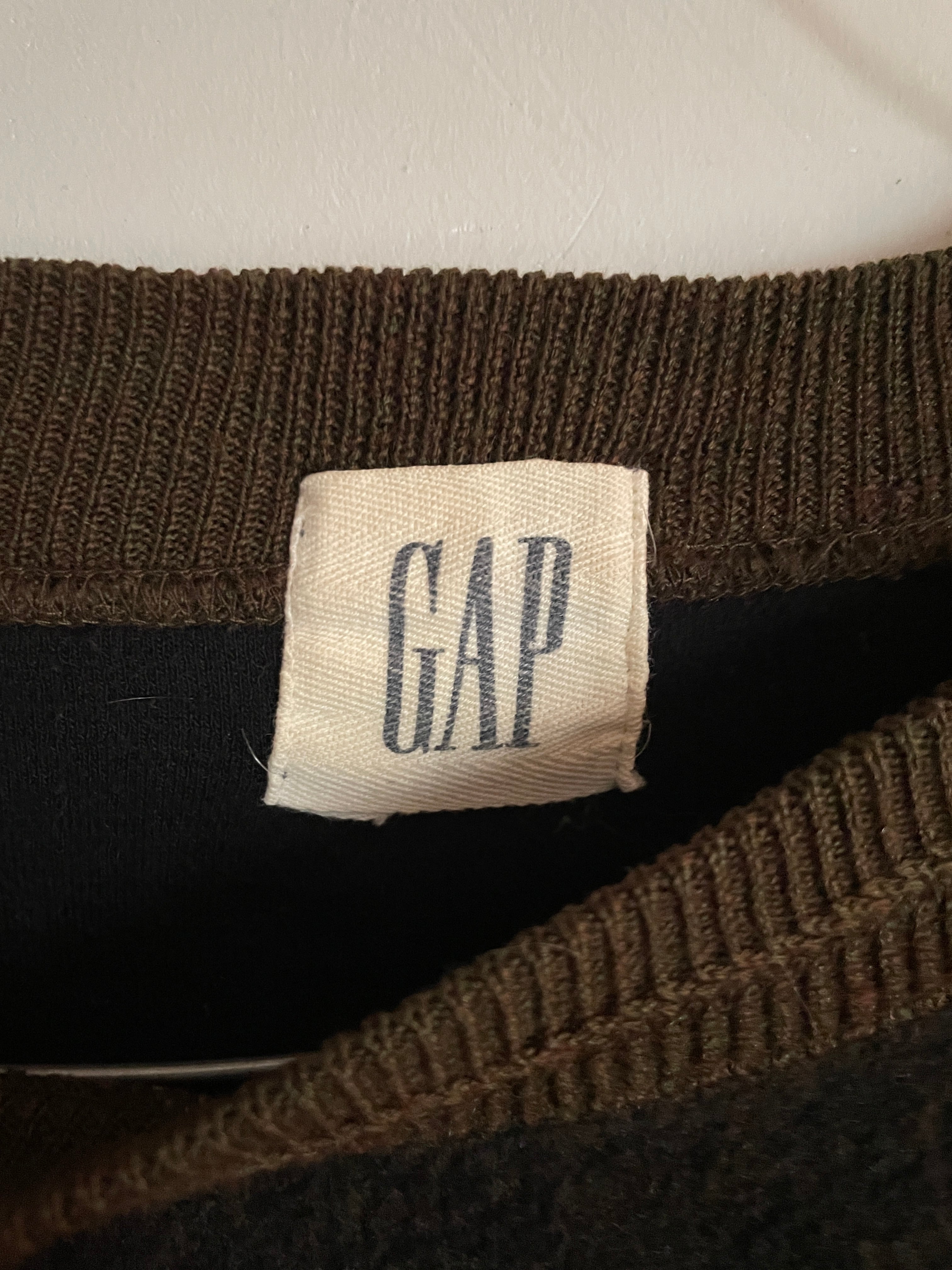濃いめのブラウンで胸に刺繍が施された、ギャップのスウェットシャツ。よく見るスウェット地に比べやや毛足があり、ふかふかとした質感はフリース素材に近いです。身幅広めでゆったり目ですが丈は長過ぎず良いバランス。ウールが混ざっているため保温性も高いです。