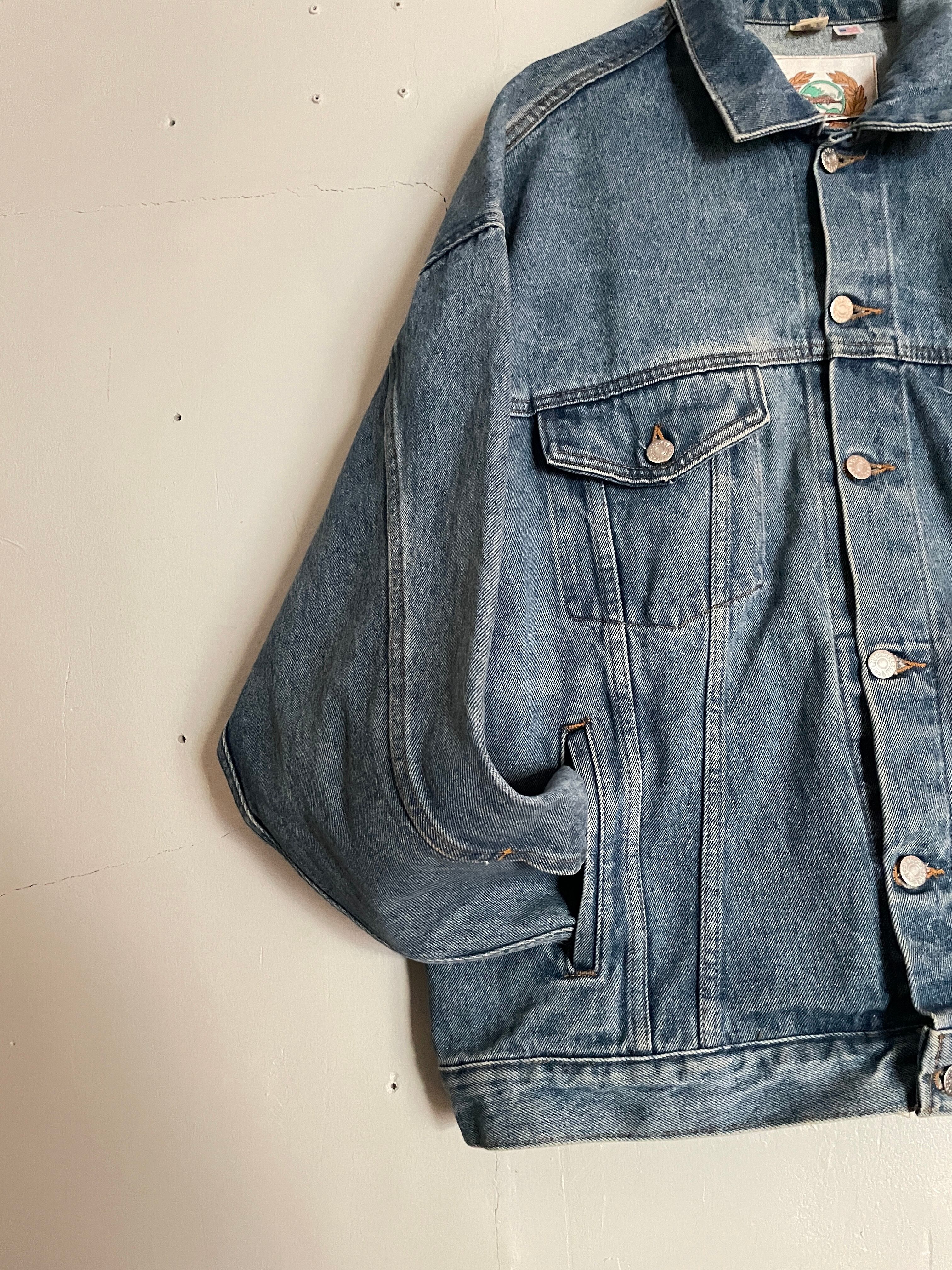 褪せたボディに、ユニバーサルスタジオのボコッとした凹凸のあるデザインがバックに施された、デニムジャケット。プリントやワッペンなどはよく見かけますが、こういったデザインは珍しいかと思います。前後でしっかりとメリハリがあるのがグッドです。ゆったりとしたサイズ感でなので、男性の方はもちろん、女性の方も大きめで着ると可愛らしいかと思います。USA製なのも魅力的です。