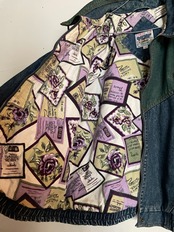インディゴボディに、様々な生地、柄がパッチワークされたデザインデニムジャケット。ギザギザに貼り付けられたお洒落な柄や、インディゴとは違ったデニム生地などデザイン性に長けた一着です。上半分だけデザインされている事から、センスを感じます。程良い丈感にたっぷりな身幅。今っぽいシルエットで着られそうです。裏地はおしゃれな花柄でフワッとしたフリース素材。保温性も抜群です。細かな部分まで、手の込んだ面白みのあるアイテムです。