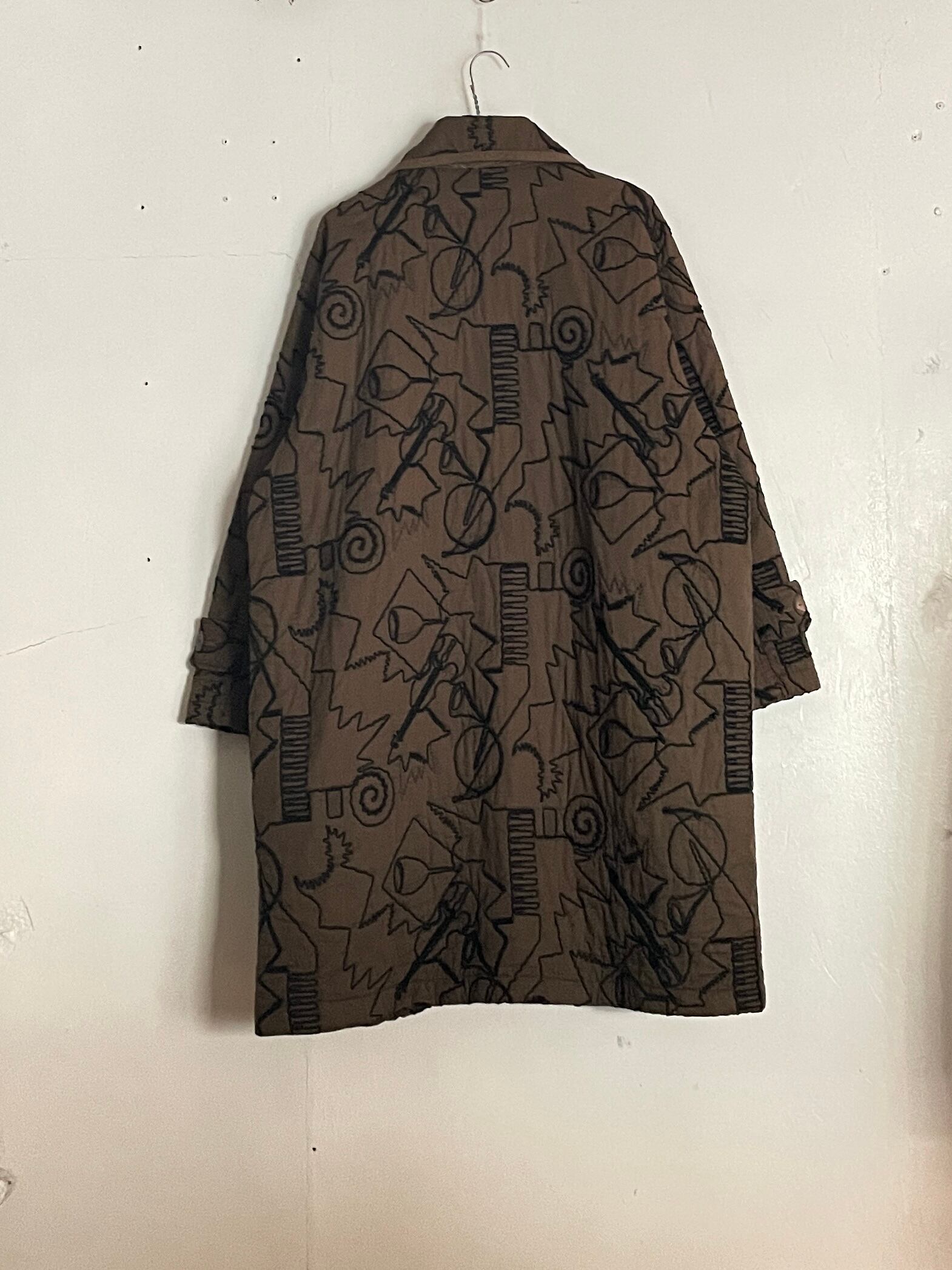 ブラウンボディに、くねっとした糸で、様々な模様が全体に施された、デザインジャケット。ワイングラスだったり、バイオリンだったりと、見ているだけで面白いアート感のある一着になってます。糸も太めなので立体感もあって雰囲気抜群のアイテムかと思います。厚めな生地感で保温性にも優れています。ゆったりとしたサイズ感なので、インナーにもしっかり着込めて、この冬にはメインを張ってくれるアイテムです。