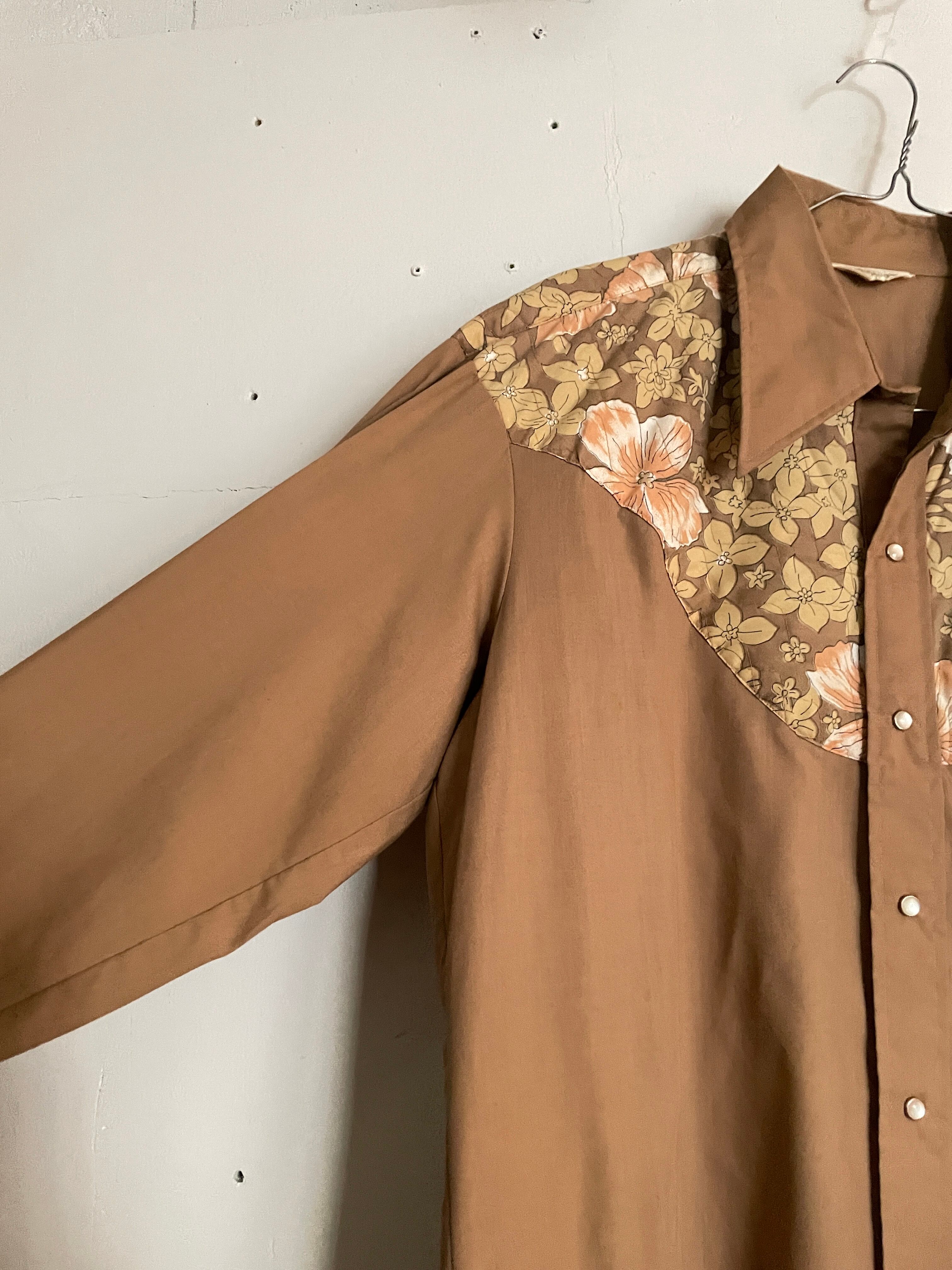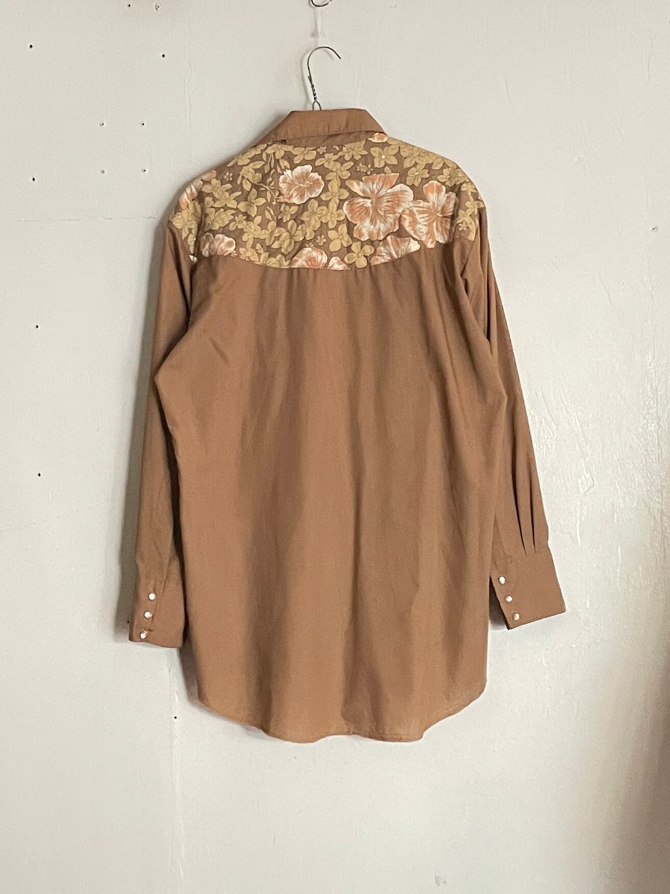 ライトブラウンボディで、花柄の切り返しがお洒落な、ウエスタンシャツ。メリハリがしっかりとあるデザインが魅力的です。大振りな襟からは70年代らしさが感じられます。ポリとコットンのサラッとした質感で、ゆったりめなサイズ感になってます。今の時期にはインナーとしても活躍してくれます。春先などにはファッションの主役になってくれるアイテムです。