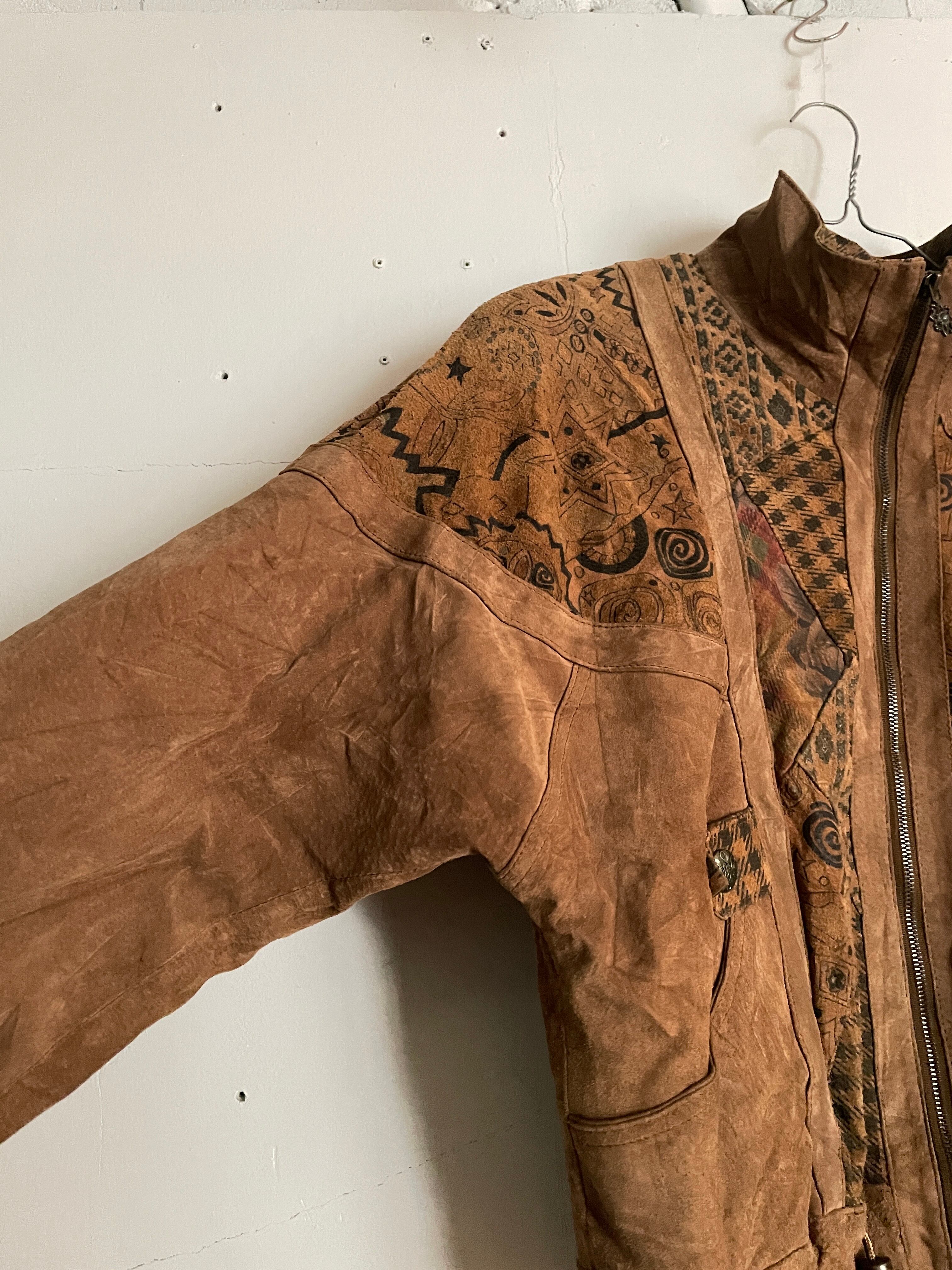 スレたブラウンボディに、様々な柄の切り替えが施された、スエードレザーデザインジャケット。三角型に分かれたアーティスティックな模様。目が惹かれるおしゃれなデザインになってます。ジップやストラップボタンなどもアクセっぽくてグッド。ハイネックなのもありがたいです。裏地はサラッとしたナイロン素材。裾上にはドローコード付きで縛って着てもまた違ったシルエットになって面白いかと思います。