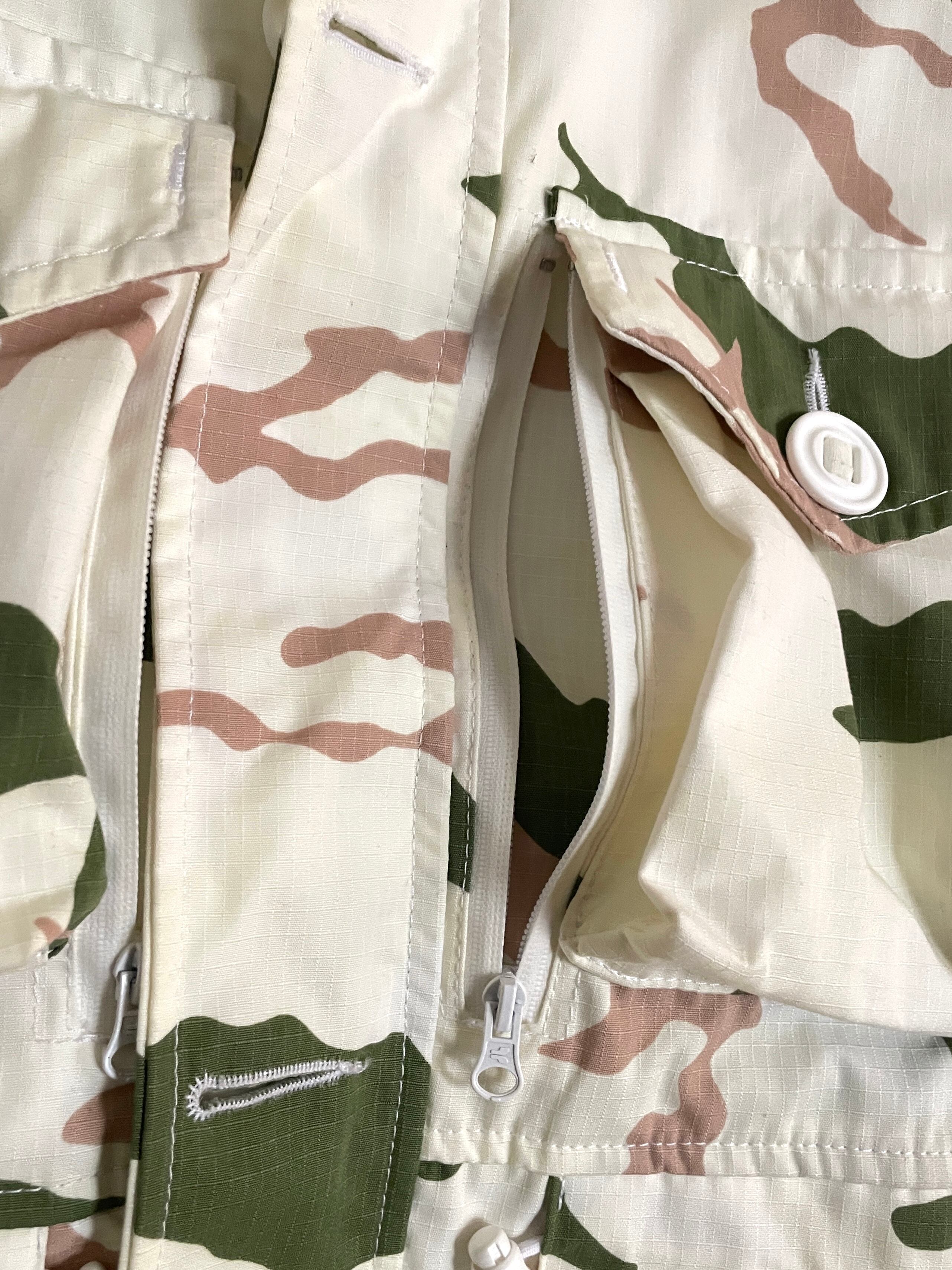 世界中の軍や特殊部隊に、耐久性に優れた高品質の製品を提供してきたイギリスのブランド、アークエアのコンバットジャケット。こちらはタウンユース向けに改良された一着で、白をベースとした迷彩柄は「ツンドラ」と呼ばれ、寒地高原地域向けに作られた特殊迷彩です。前には大きめのフラップポケットが4つと中央のジップポケットが2つ、前開きは上下どちらからも開閉可能なダブルジップ仕様。比較的タイトめなサイズ感も特徴で、軽くてサラッと羽織れる、春も意識した機能性に富んだジャケットです。