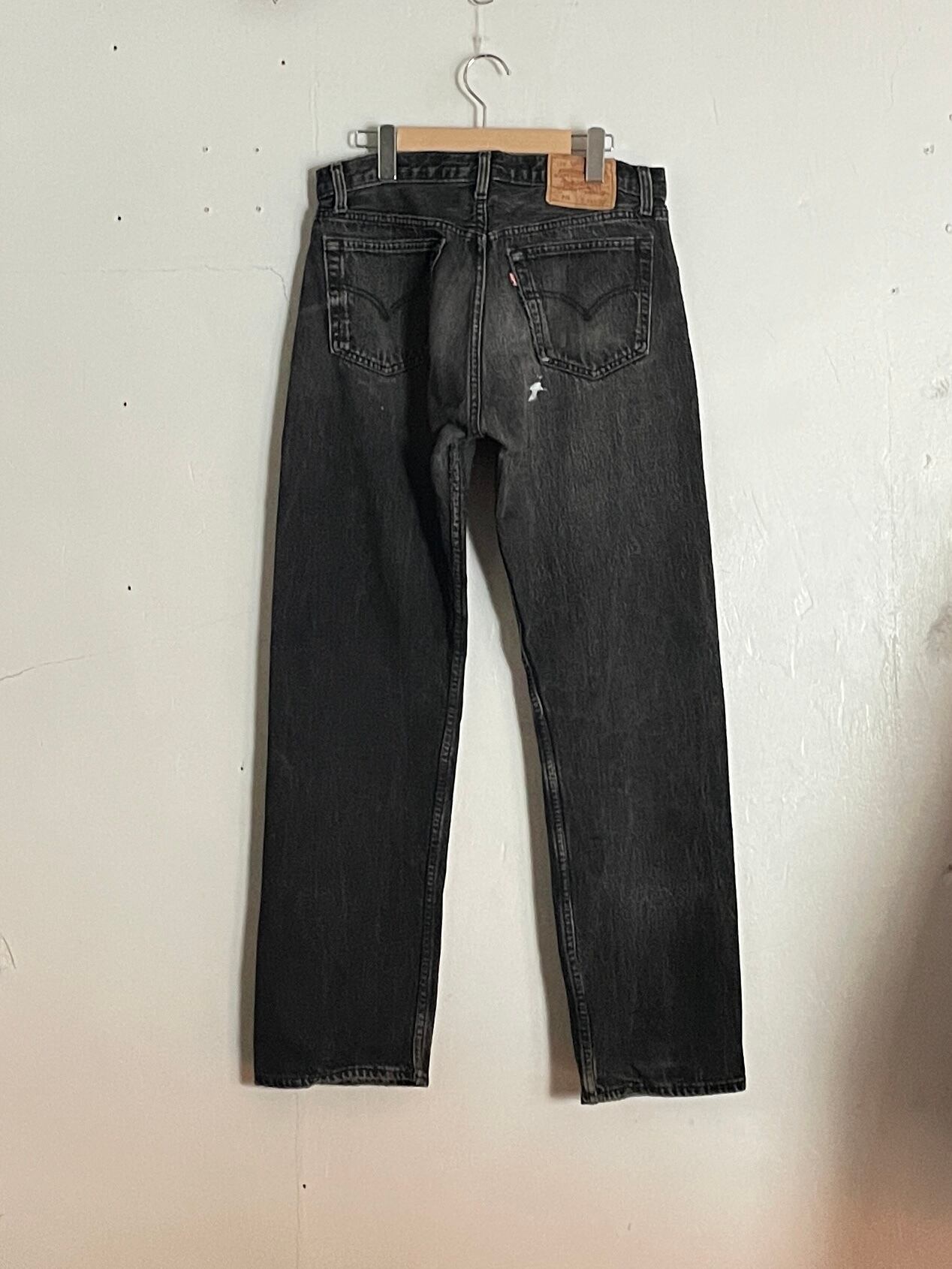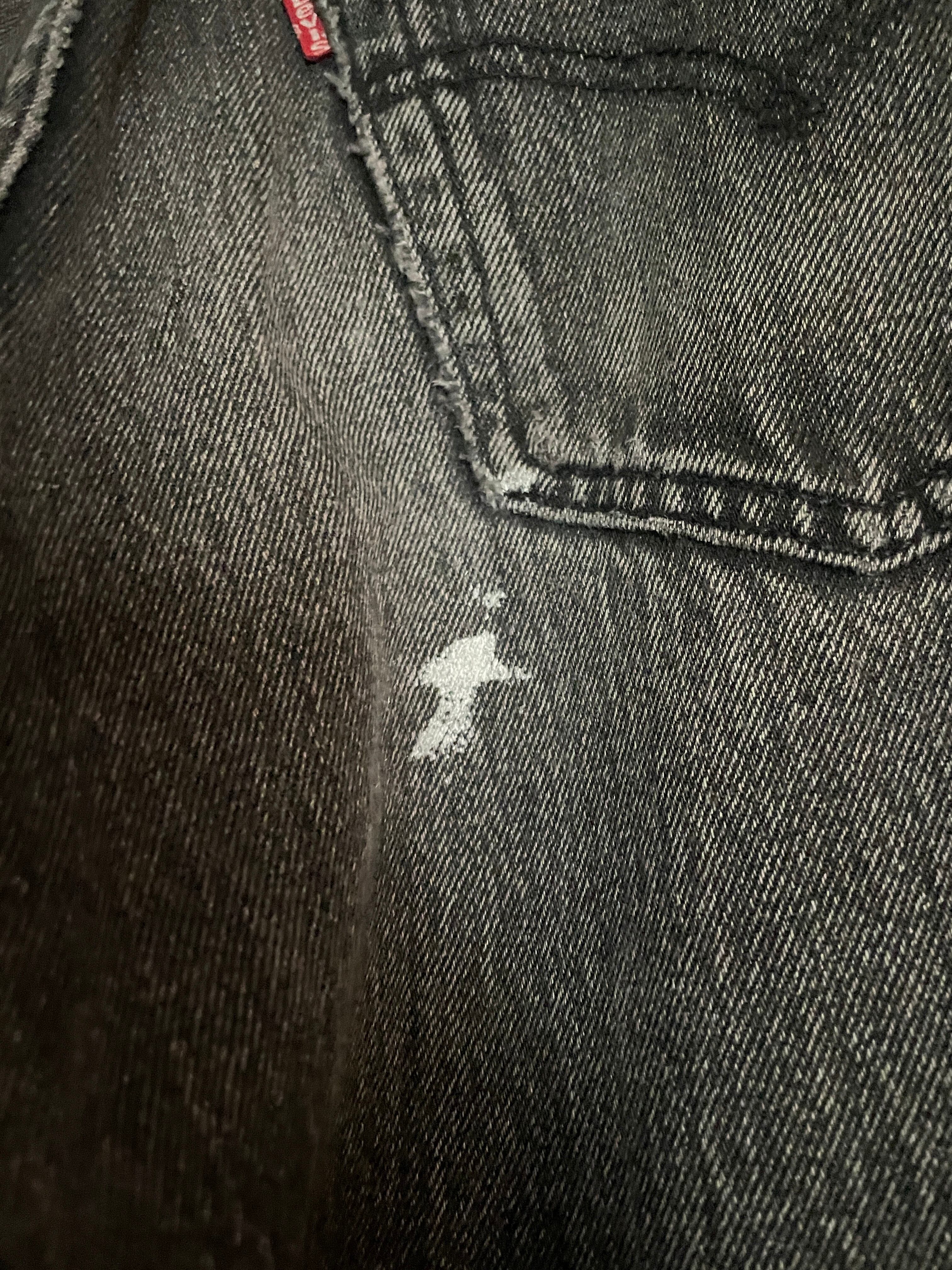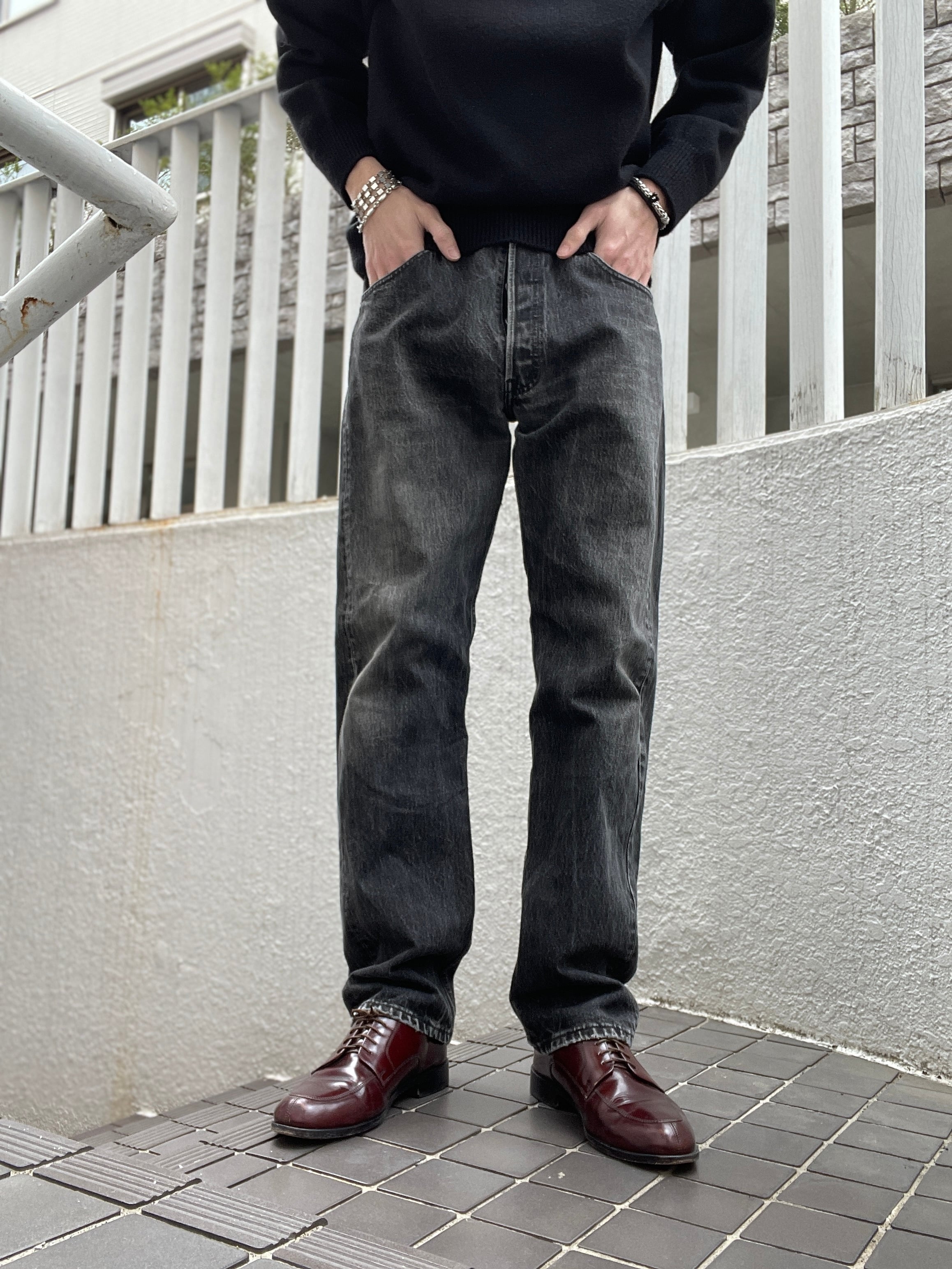 雰囲気のある良い褪せ方をした、リーバイス501ブラックデニムパンツ。程良くワイドで綺麗なストレートなシルエットです。レングスも長めなので、靴にしっかり溜まってくれそうです。ブラックデニムは一本持っておくとかなり重宝するかと思います。カナダ製なのもポイントです。バック部分に1ヶ所ペイント跡が見られますが、これもこれでかっこいいかと思います。
