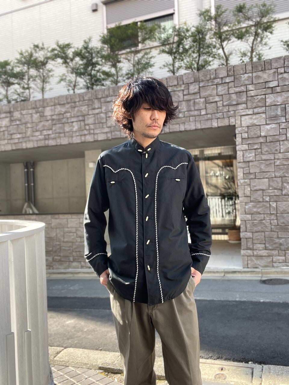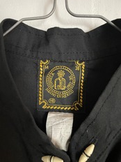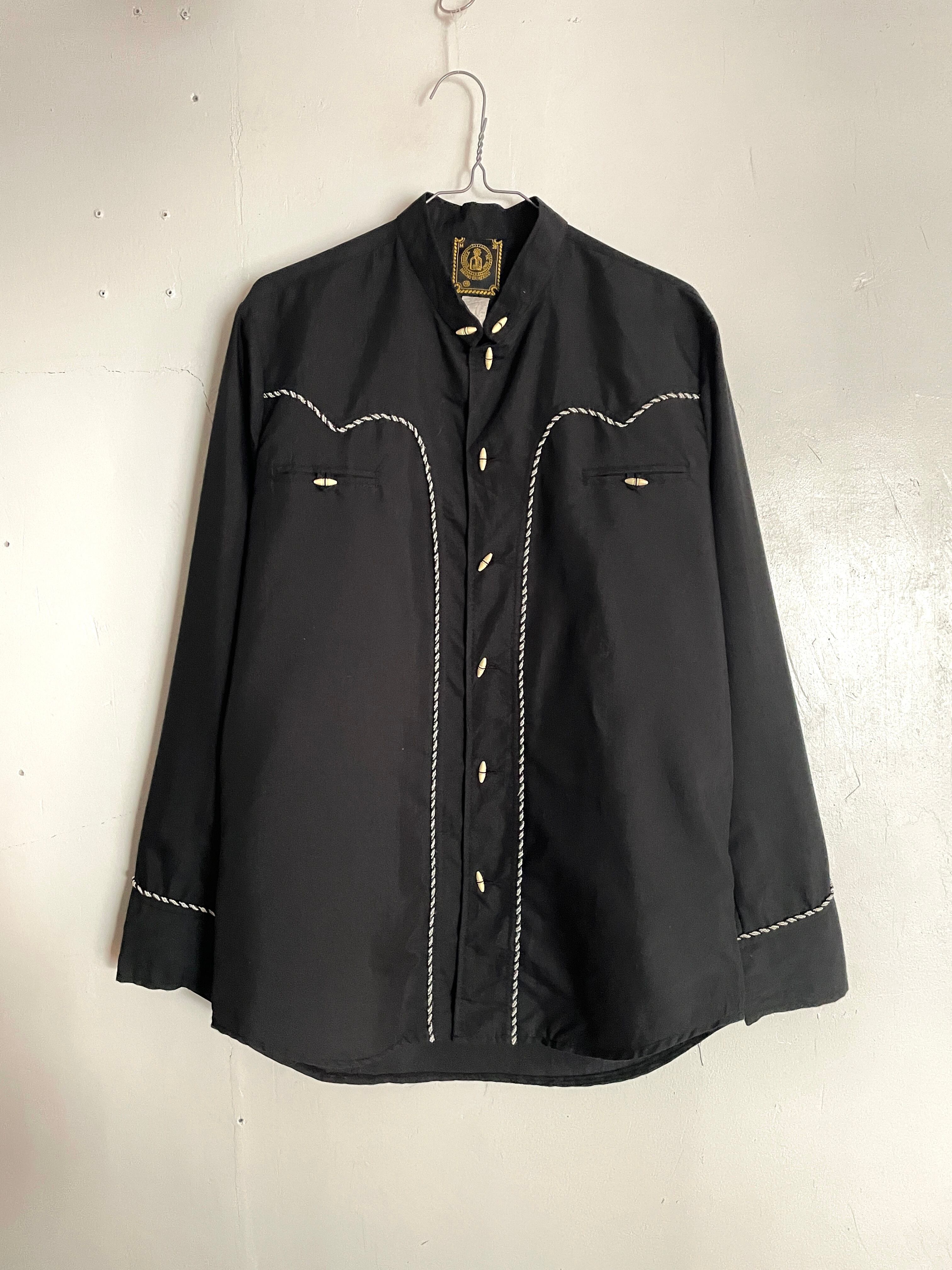 ウエスタン調の切り替えデザインで、チャイナシャツ等に見られるボタンが特徴的なノーカラーシャツ。切替え部分に白黒の紐が縫い付けられているデザインは、50年代のアイテムに見られるロカビリー調のイメージを感じさせてくれます。胸には玉縁ポケット付き。いろんな年代のディテールをうまく一枚にまとめた、お洒落で珍しい特別なシャツです。
