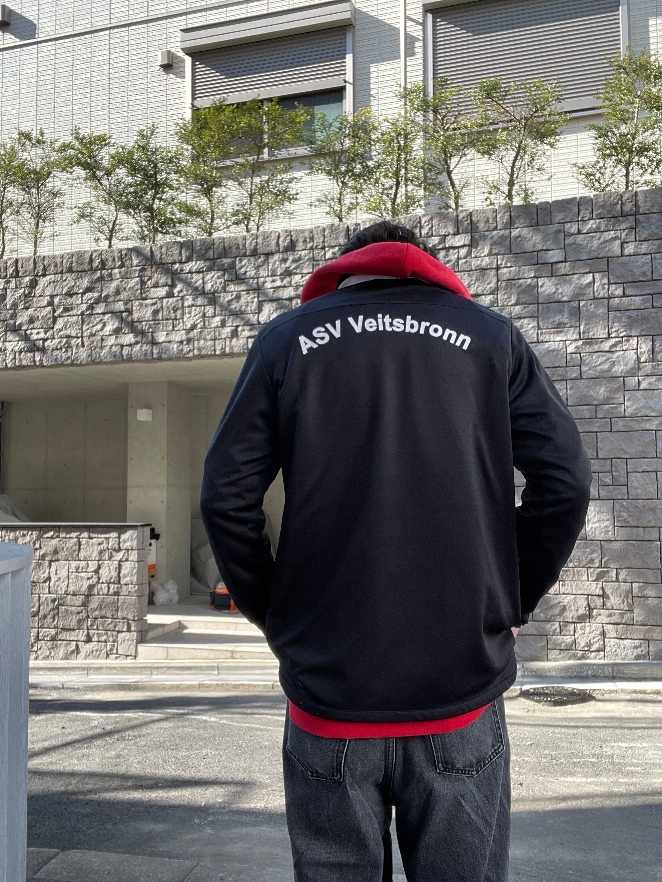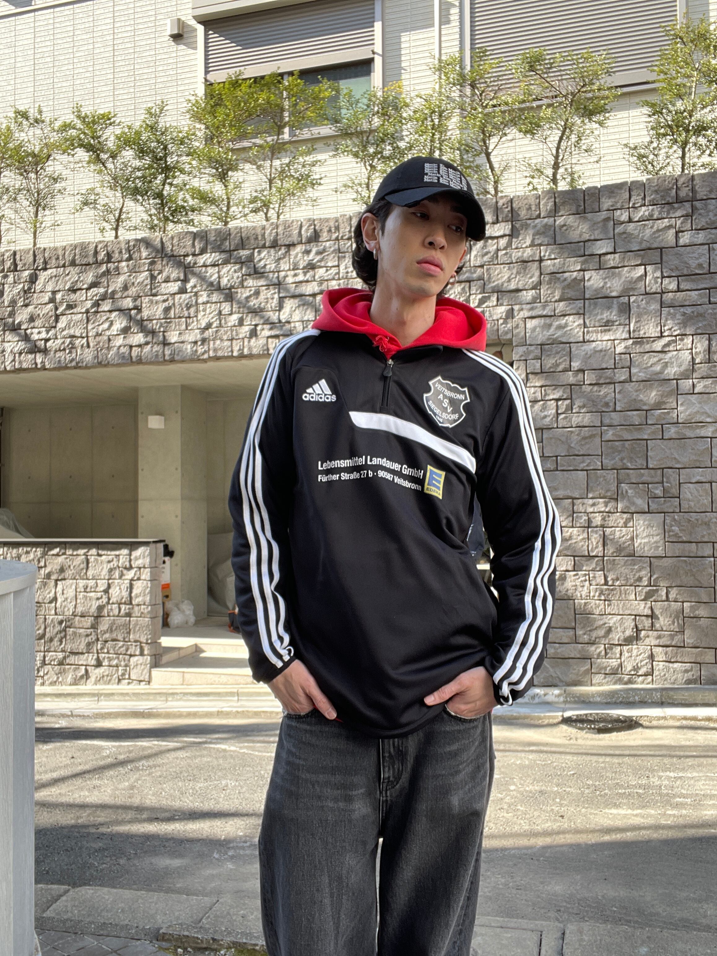 黒ボディに白のラインデザイン、ハーフジップが特徴のアディダスゲームシャツ。左胸と背中にプリントされている「ASV Veitsbronn」はドイツのローカルサッカーチームのようです。やり過ぎていないデザインは使いやすく、胸あたりの切替えデザインもお洒落です。一枚ではもちろん、インナーとしても活躍してくれる、非常に使いやすいアイテムです。サイズバランスも◎。