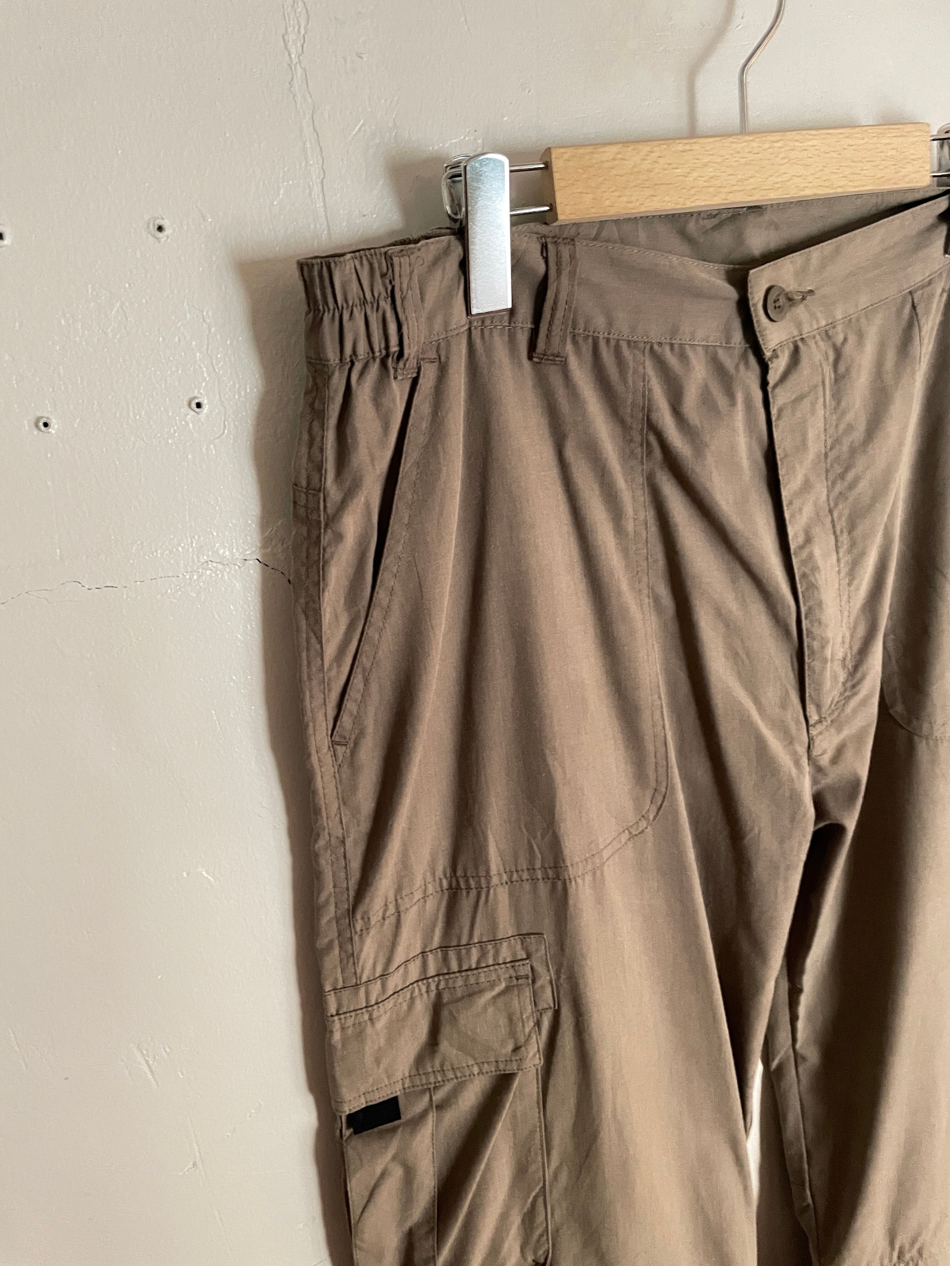 サラッと軽めなポリとコットン素材で、ショーツにもなってくれる便利な2Wayカーゴパンツ。渋さのあるベージュカラーで、ポケットがかなり多めと機能性に優れた一本です。裾にはジップ付きで、フレアシルエットで履くことも可能です。太さのあるワイドシルエットで、ルーズな丈感。季節に合わせて使い分けられるアイテムです。