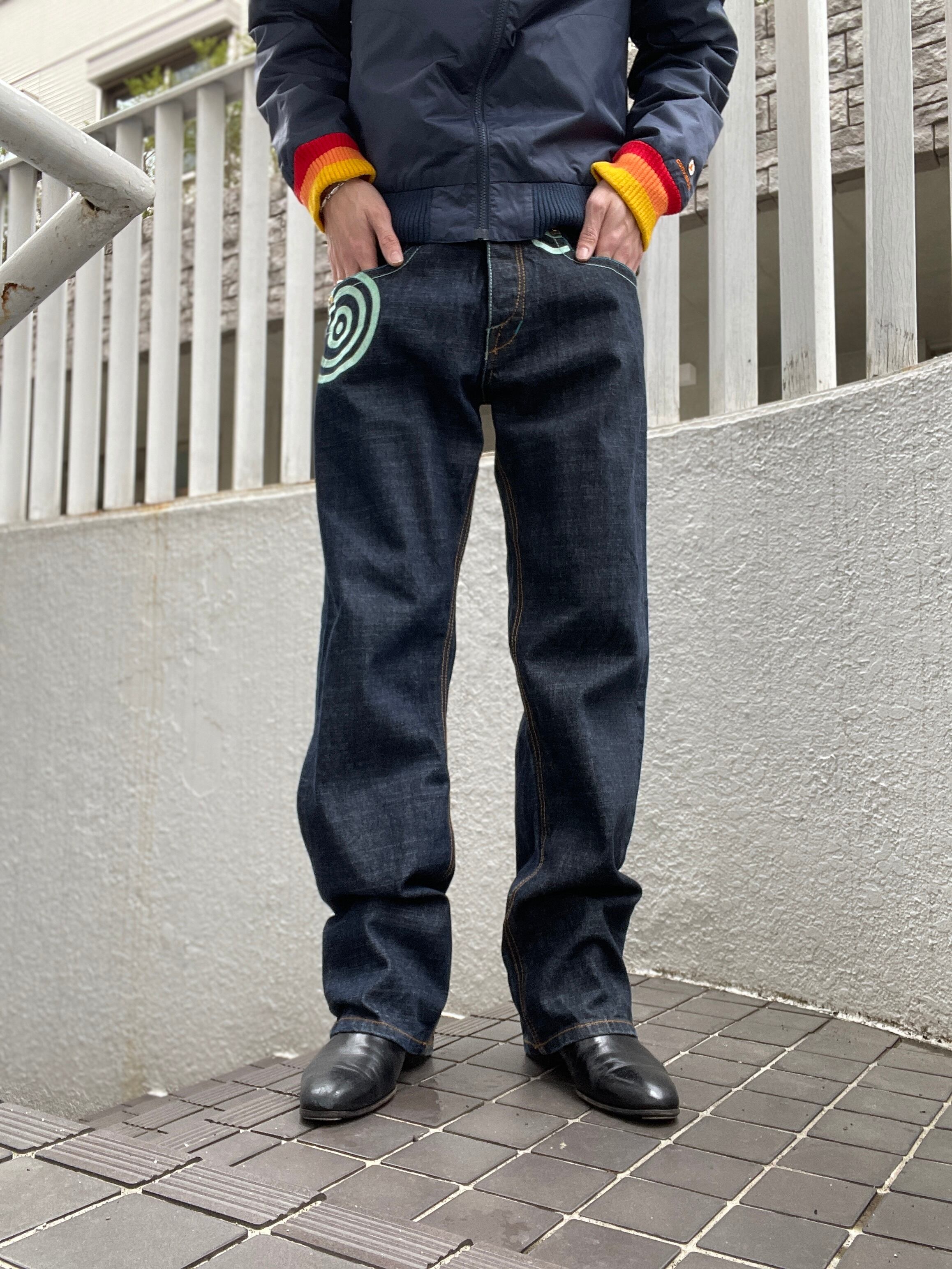 インディゴカラーに、ヒップホップのり強めな刺繍が施されたデニムパンツ。ブランドはシュマック。ブルー系をベースにした光沢のある渦巻き状の刺繍。バックポケットにはまた派手さのあるブランドロゴ刺繍が施されています。太さのあるワイドでルーズなシルエットです。ファッションのメインになってくれるパンツです。