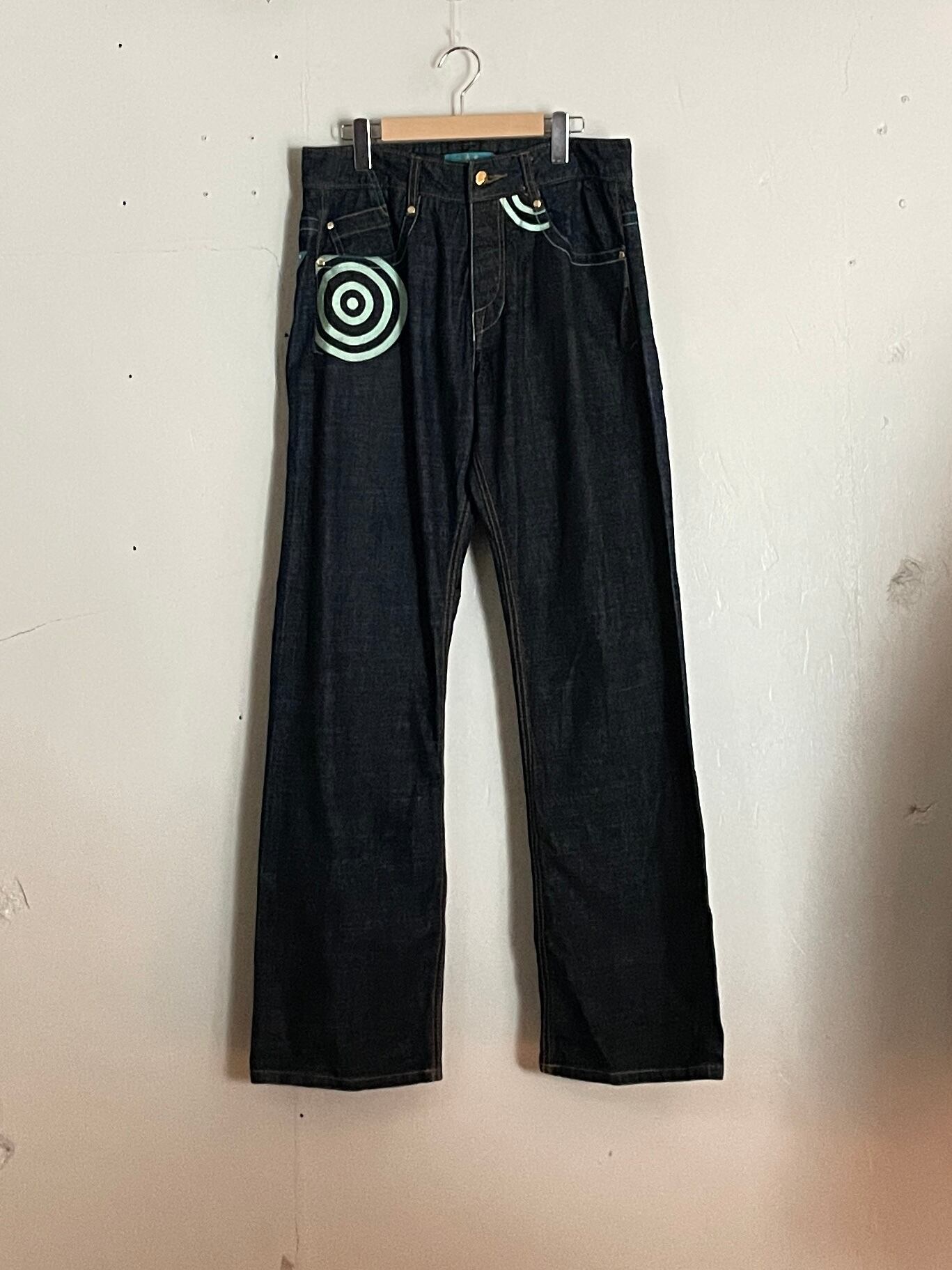 Old SHMACK Indigo Embroidery Design Wide Denim Pants