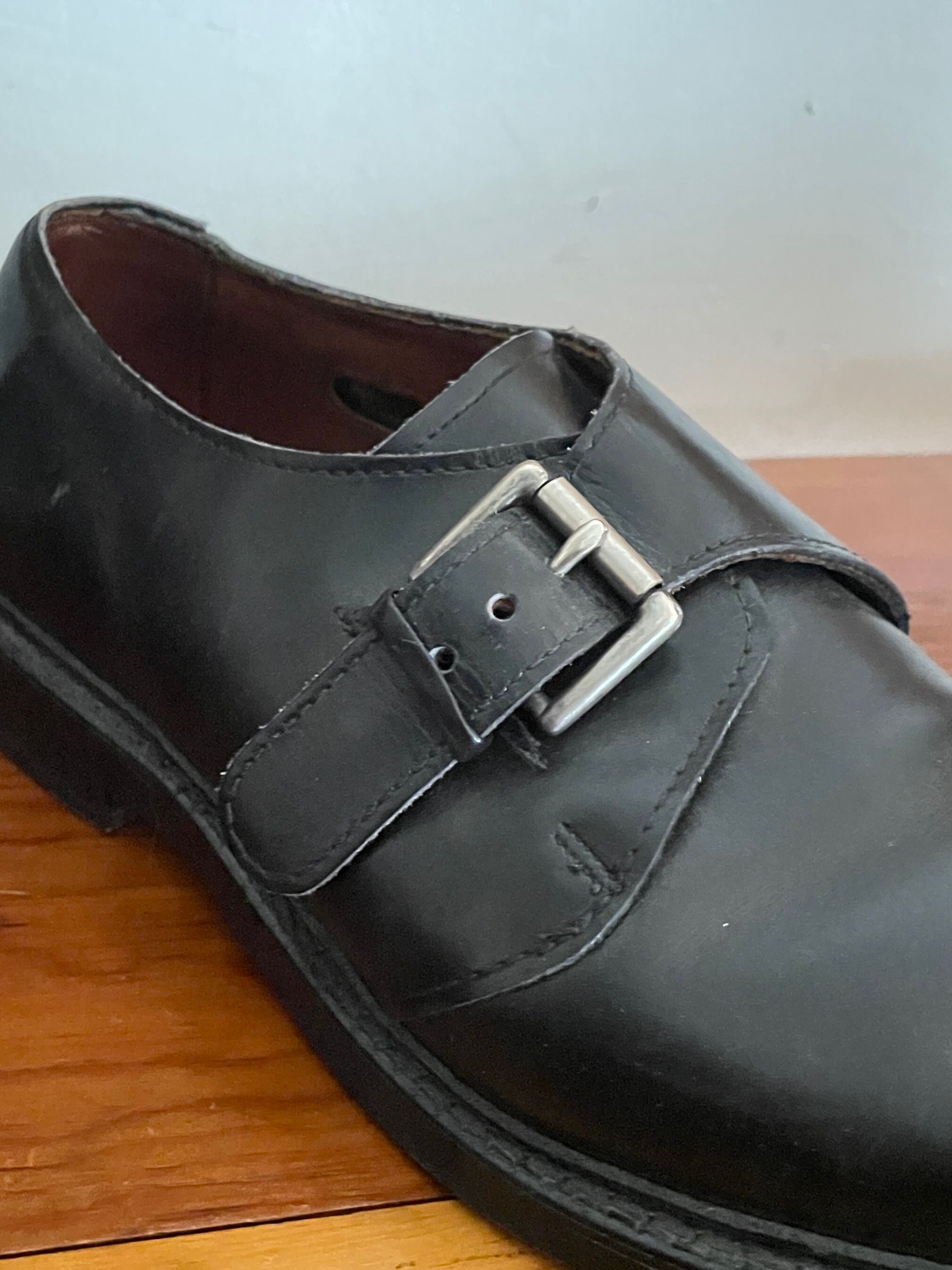 アメリカ、ウィスコンシン州に拠点を置く1922年創業のシューズメイカー、アレンエドモンズのレザーシューズ。バックル付きのストラップが付いた「モンクストラップシューズ」というモデルです。シューレースが付いていないため、ややすっきりとした印象。質の良いブラックレザーで履き心地がよく、メンズでは需要の高いサイズ感かと思います。若干の着用感はあるものの、コンディションは良好です。