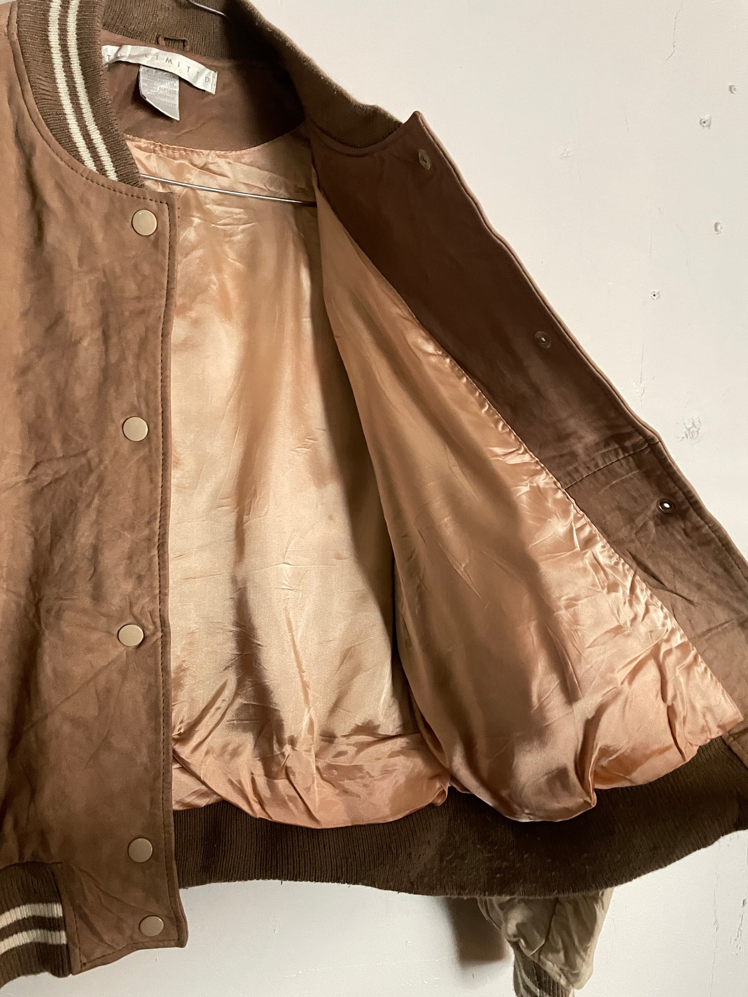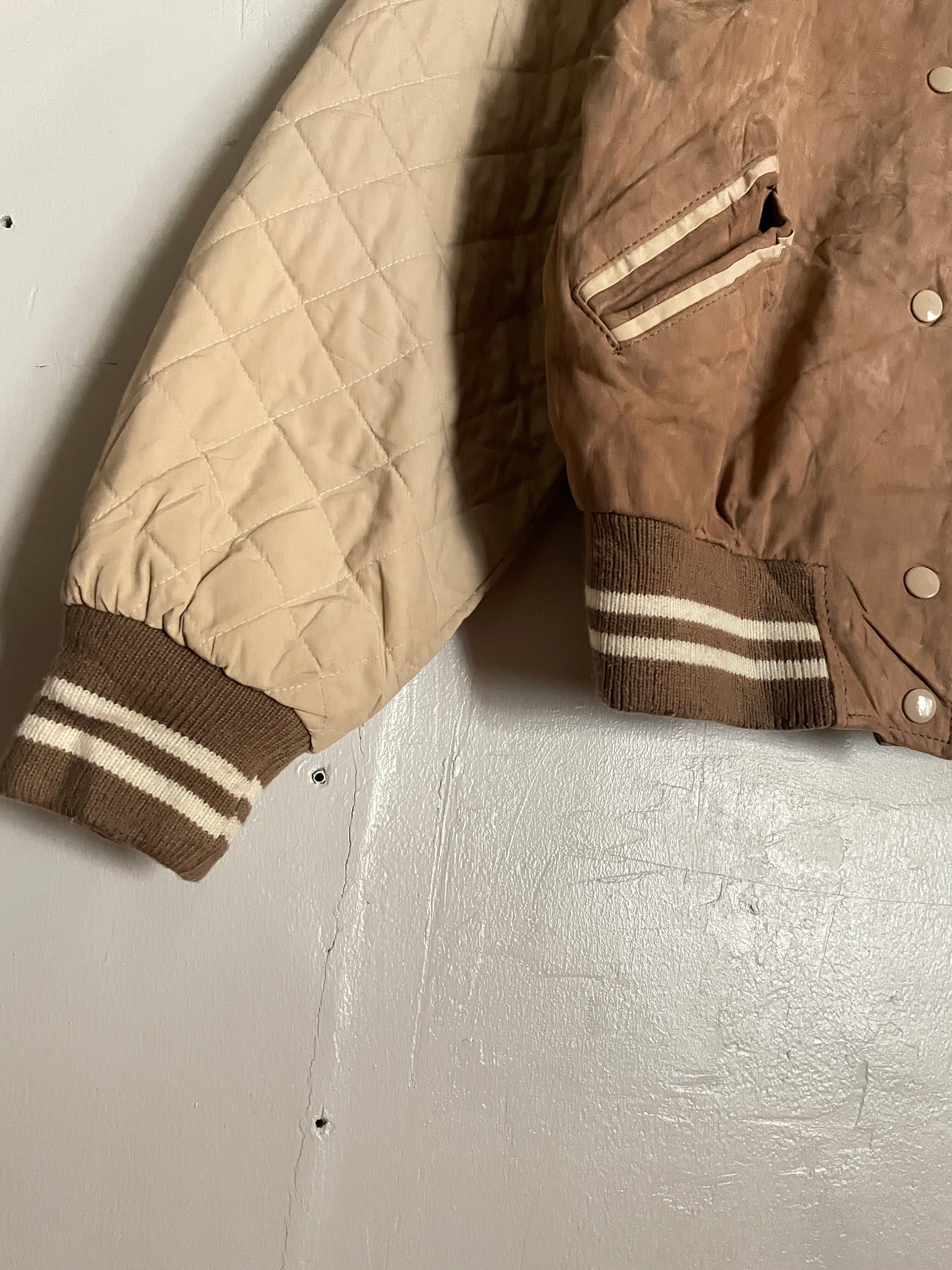 淡い色味のスエードレザーに、コットンキルティングの袖がついたスタジアムジャケット。左胸と背中にはカラフルな刺繍が施されています。ボーダーリブもお洒落。着丈短めで、見た目よりもずっと軽い着心地です。これくらいの素材感と色味であれば、春にも十分着れるジャケットだと思います。