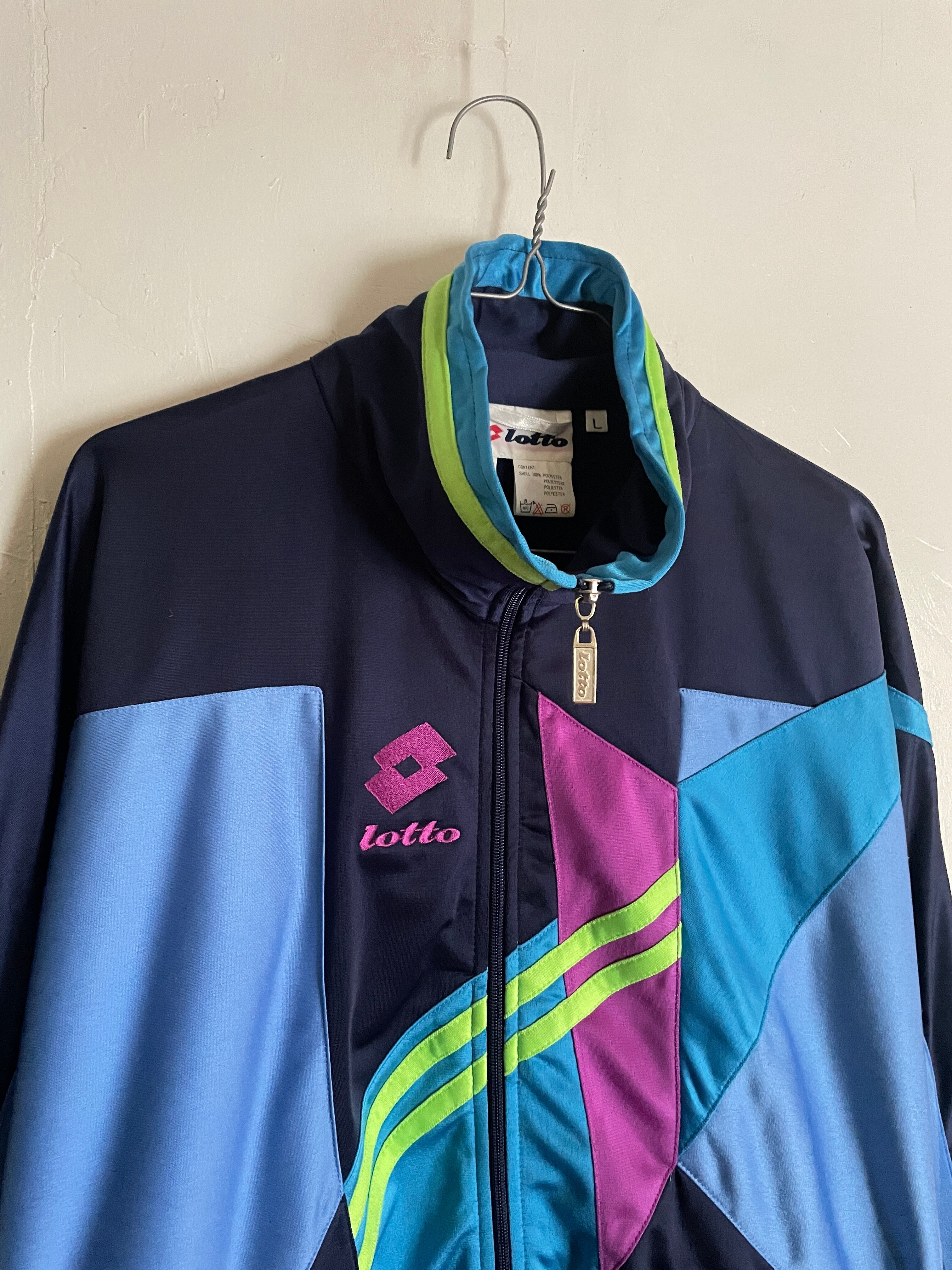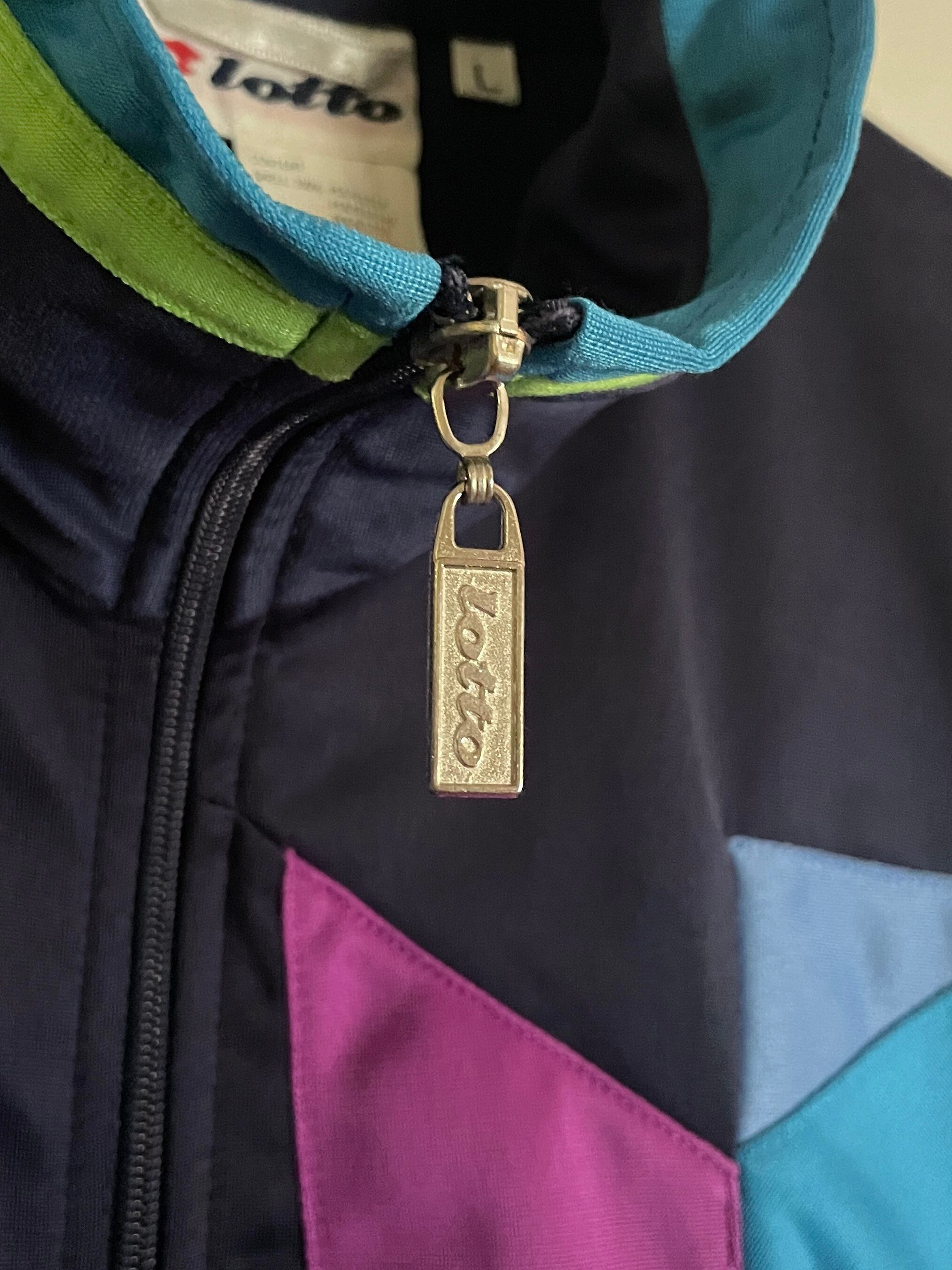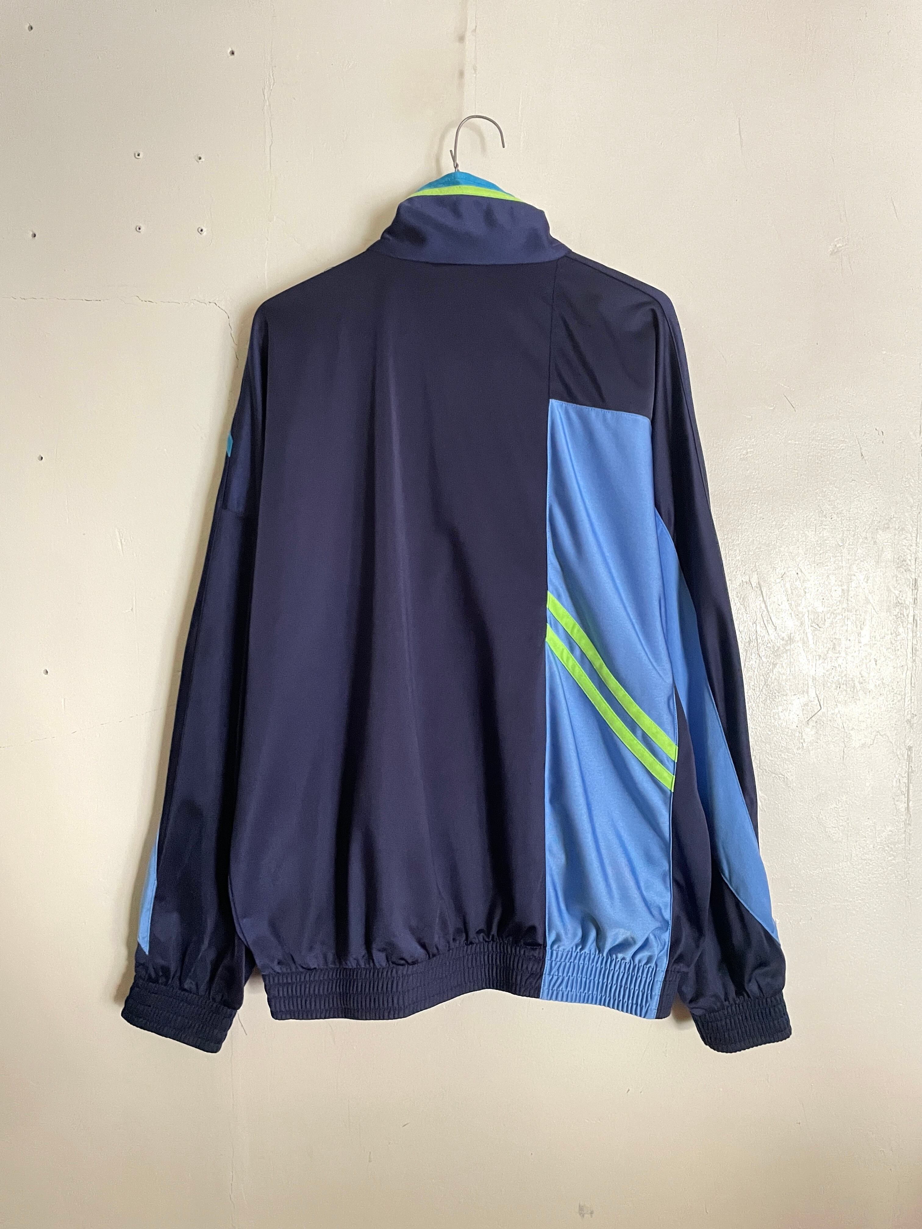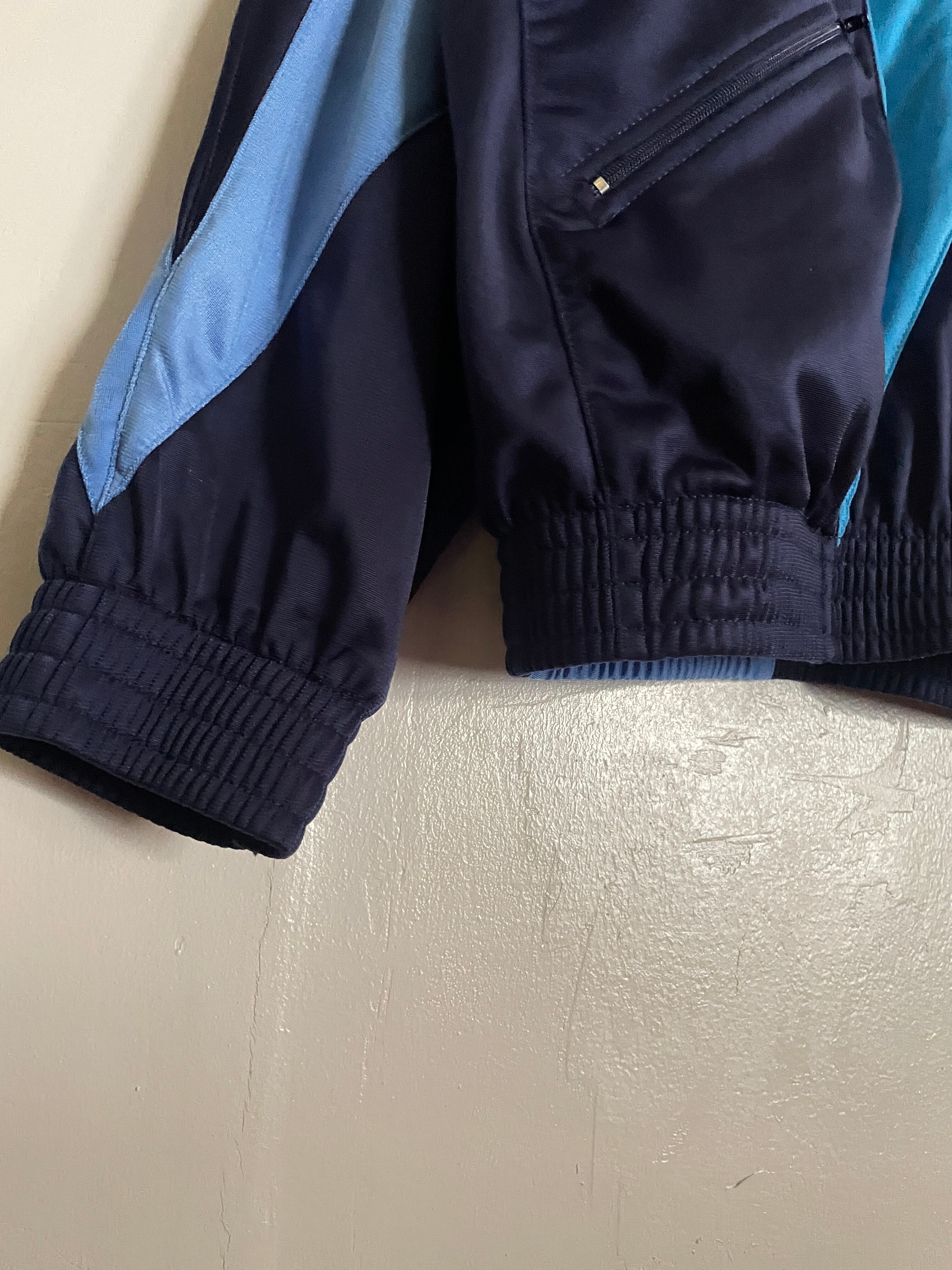ネイビーと淡いブルーを中心としたボディに、明るい色の切替えデザインがお洒落なロットのトラックジャケット。やや高めのネックで、先端部分の差し色がお洒落です。背中のアシンメトリーなデザインもポイント。ジップポケットも付いて、サイズ感も程良い、今の時期はもちろん春に向けても活躍してくれる一着です。