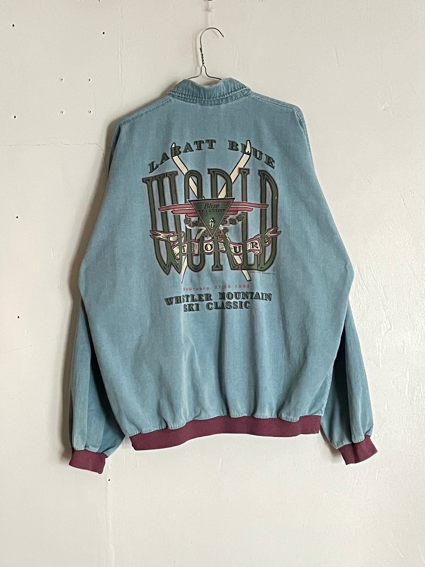 褪せたライトグリーンボディに、スキーワールドツアーのダブルプリントが施された、コットンプルオーバーシャツ。フロント部分は抑えめのワンポイント。バックにはインパクト大のでかプリントが施されています。92年のコピーライト入り。袖口、裾はリブ使用。サラッと軽めなコットン素材なので、ラフに着やすいアイテムかと思います。