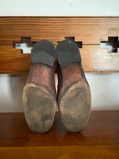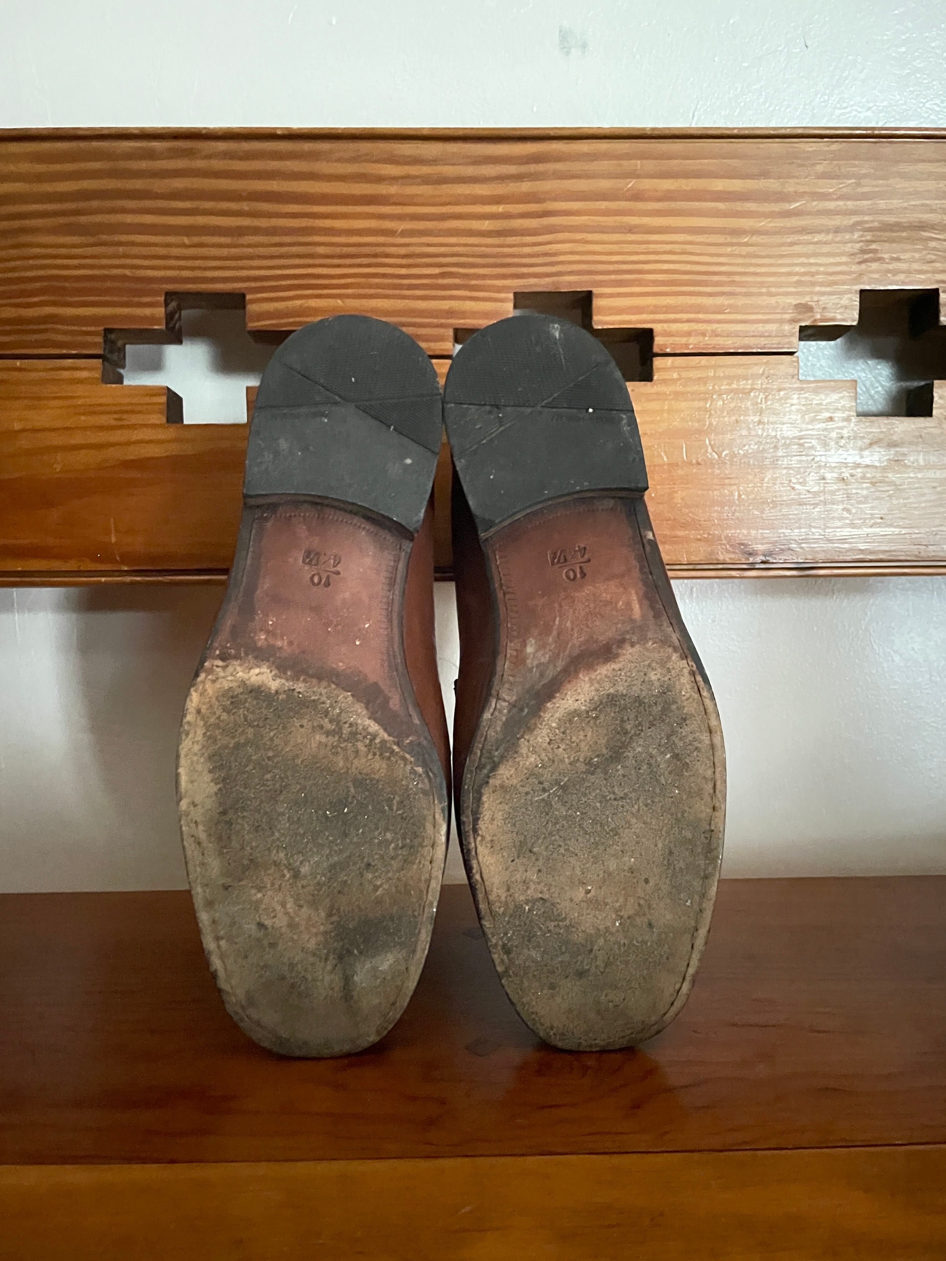ブラウンカラーで、様々なアイテムとの相性の良いレザーコインローファー。ややスクエアしたシルエットが魅力的です。綺麗めにもカジュアルにも落とし込める万能な一足。すぽっと楽に履けるのもグッドです。使用感などはございますが、ソールの減りも少なく、コンディションは◎です。