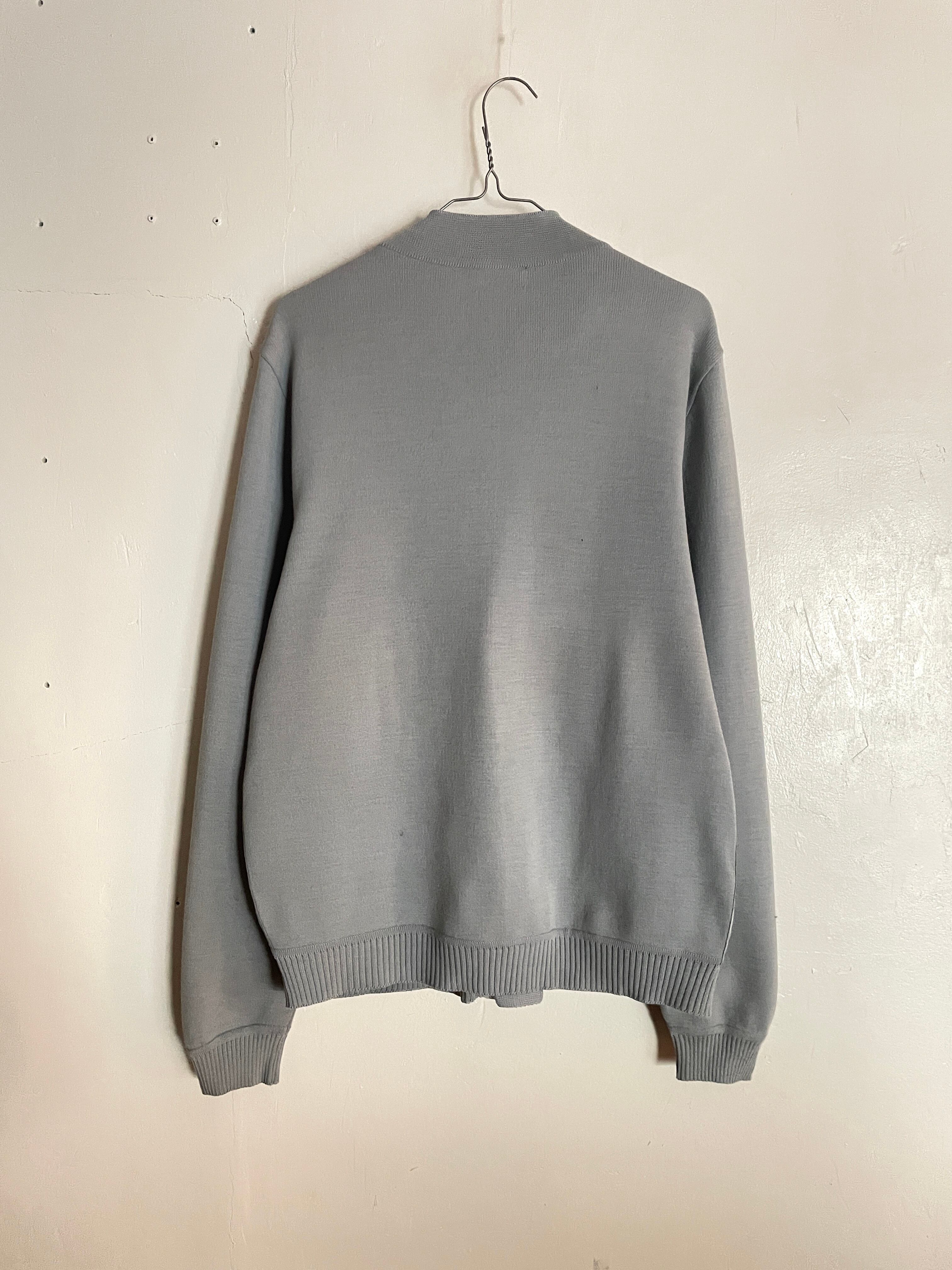 淡いグレーを基調とし、ウールのニット素材と合皮で組み合わされたデザインカーディガン。スエード調の合皮は滑らかな触り心地で、部分的な編み込みデザインがお洒落です。前にはアウトポケット付き、合皮部分には裏地が付いていて、カーディガンでは珍しい内ポケット付きな所もポイントです。アメリカ製。