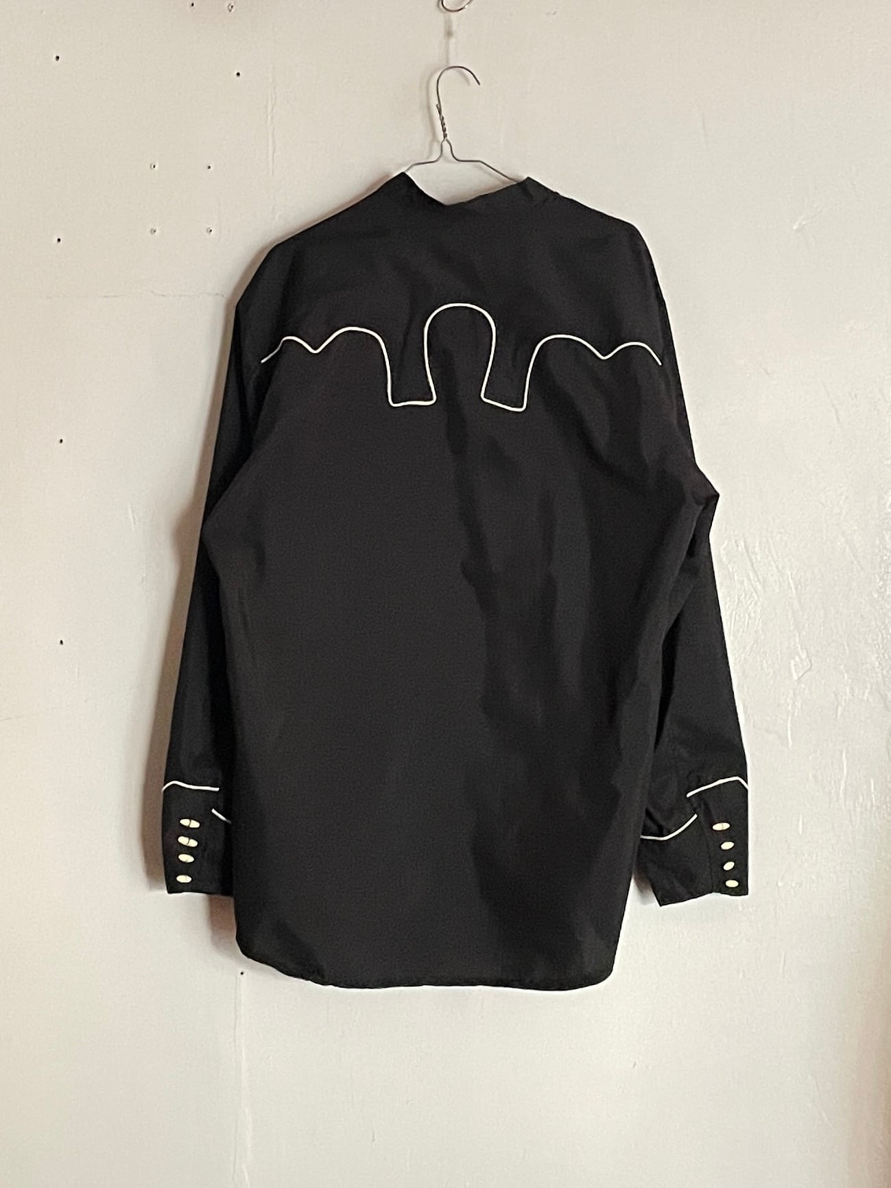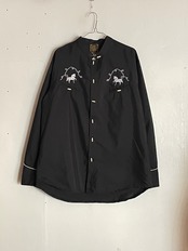 ウエスタンっぽさのあるデザインで、チャイナシャツ等に見られるボタンが特徴的なノーカラーシャツ。やや光沢のあるブラックボディで、斜めに付いたポケット上にはシルバーカラーの馬刺繍。バックの切り返し部分にはホワイトの切り返しライン。独特な形のラインからは70年代いっぽさを感じられます。ゆったりとしたサイズ感なのでラフに着られるのも魅力的です。デザインの効いた珍しいアイテムです。