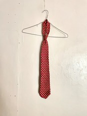 赤をベースに小さなペイズリー柄が散らばったネクタイは、ブルックスブラザーズのもの。柄をよく見ると、黄色と白の配色がハルジオンにも見えて可愛らしいです。太過ぎず細過ぎない剣先で、色々なシチュエーションに使えそうな一本。男性、女性どちらにもおすすめです。アメリカ製。