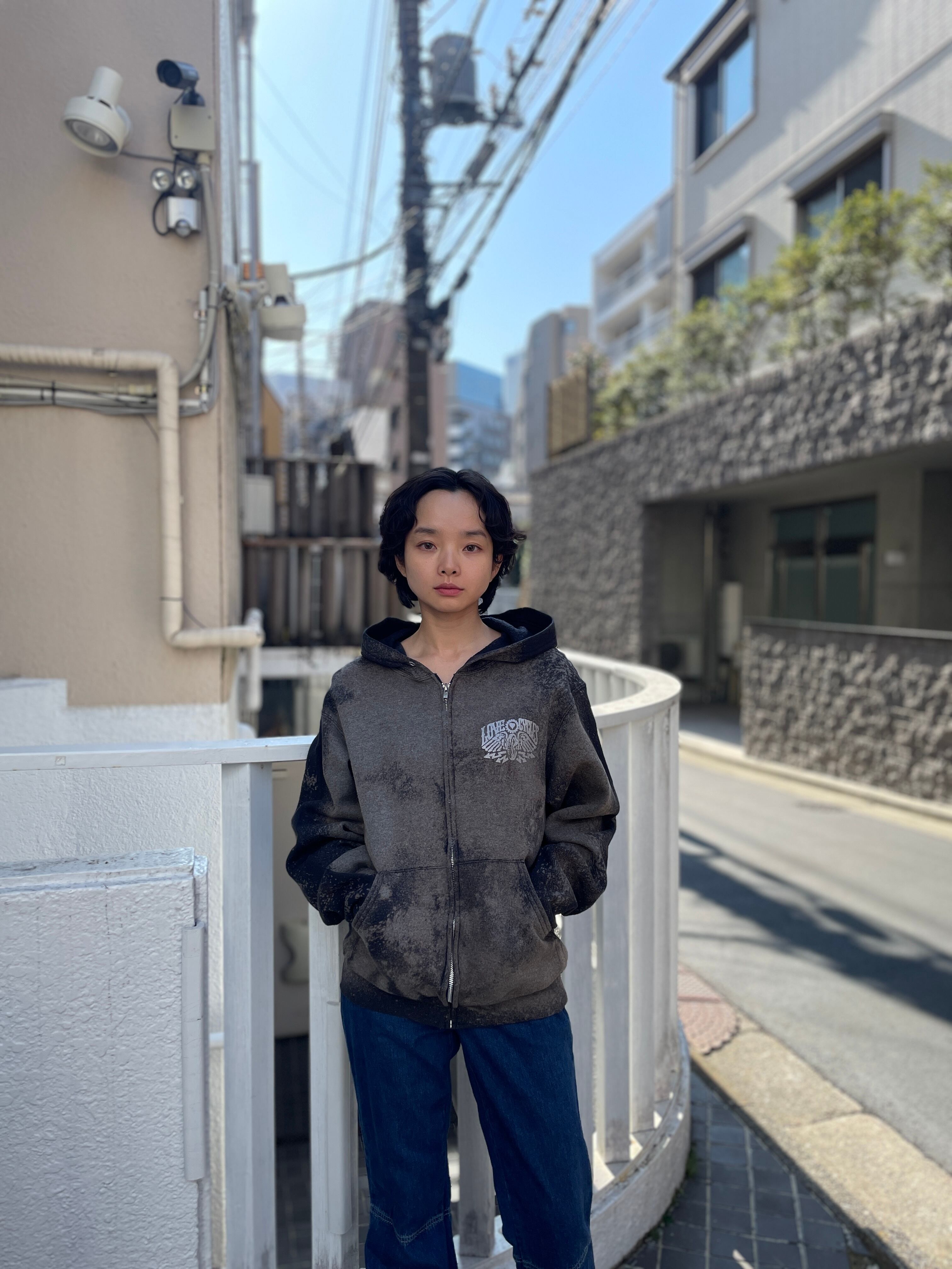 ブラックボディがブリーチ染された、雰囲気のある色味に両面プリントが施された、ジップパーカー。バイカーノリの感じられるシルバープリント。フロント部分に抑えめな胸元プリント、バックはインパクトのあるデカプリントが施されています。程良い丈感に、広過ぎない身幅なので、今の時期にはインナーとしても活躍してくれます。Y2Kな雰囲気も感じられるお洒落なパーカーです。