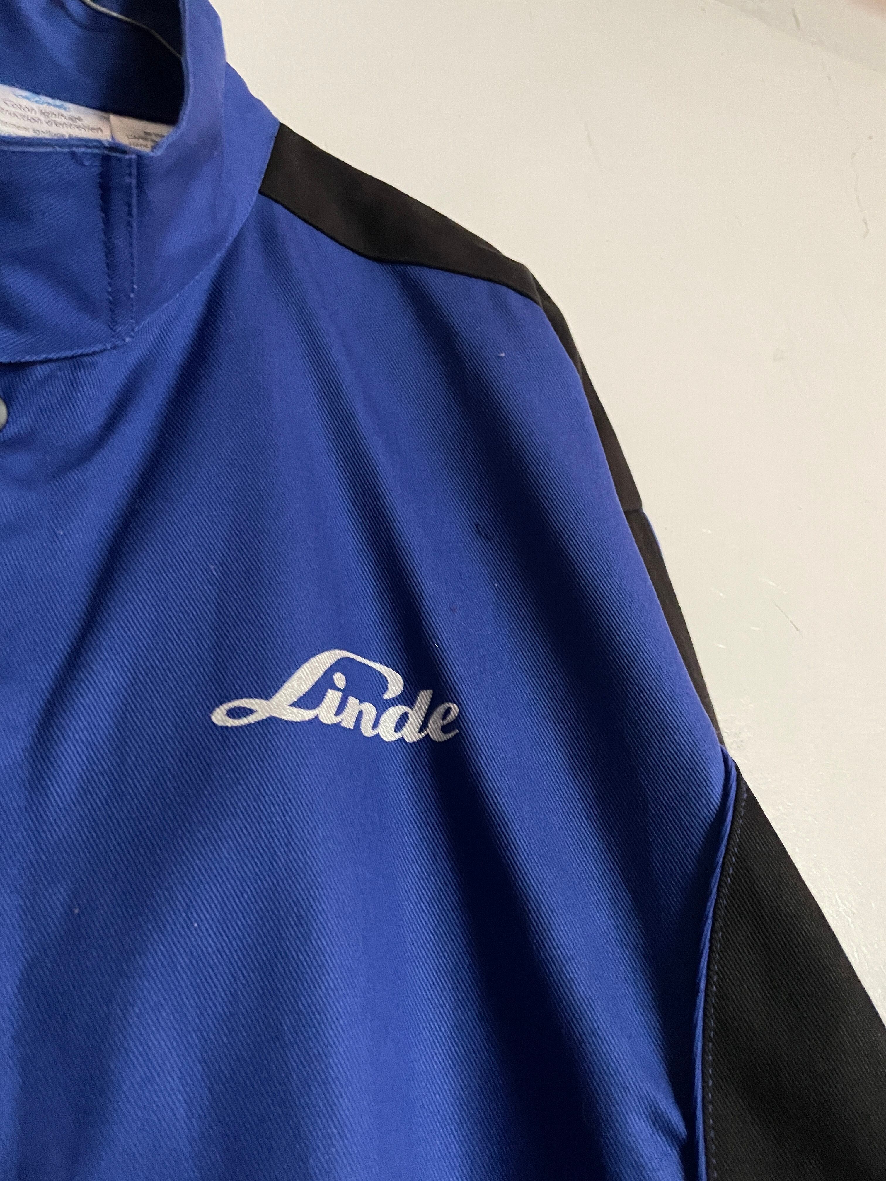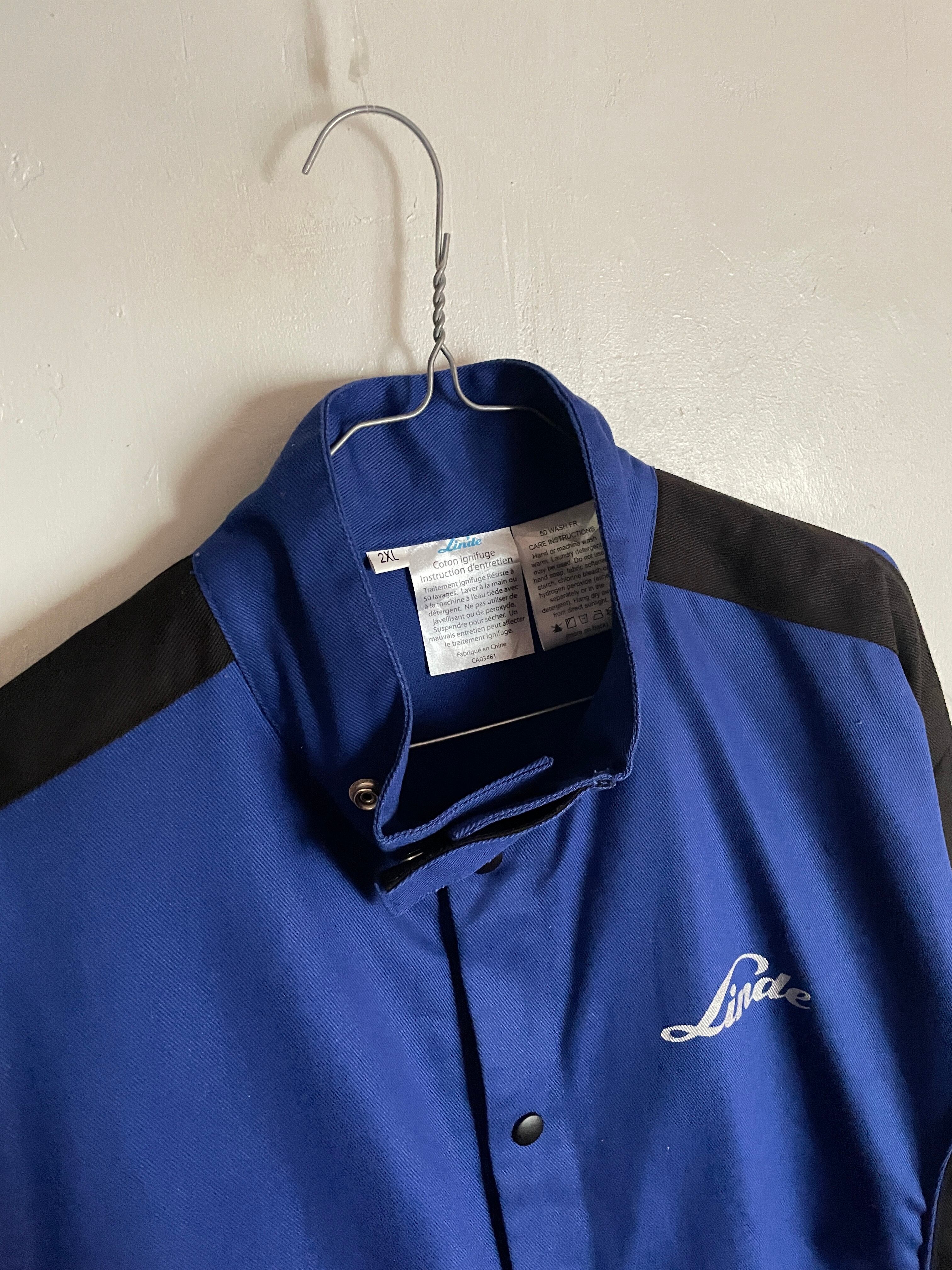 ブルーボディにブラックとクールな配色が魅力的な、ワークジャケット。脇下のファイアープリントがさりげなくてお洒落。フロント部分には光沢のある企業プリント入り。スナップボタンなので着脱しやすいのもポイントが高いです。身幅にはアジャスタ付きで、身幅を調節することができます。2XLとかなりのビッグサイズ。今の時期にはもちろん、これからの時期にはファッションの主役になってくれそうなアイテムです。