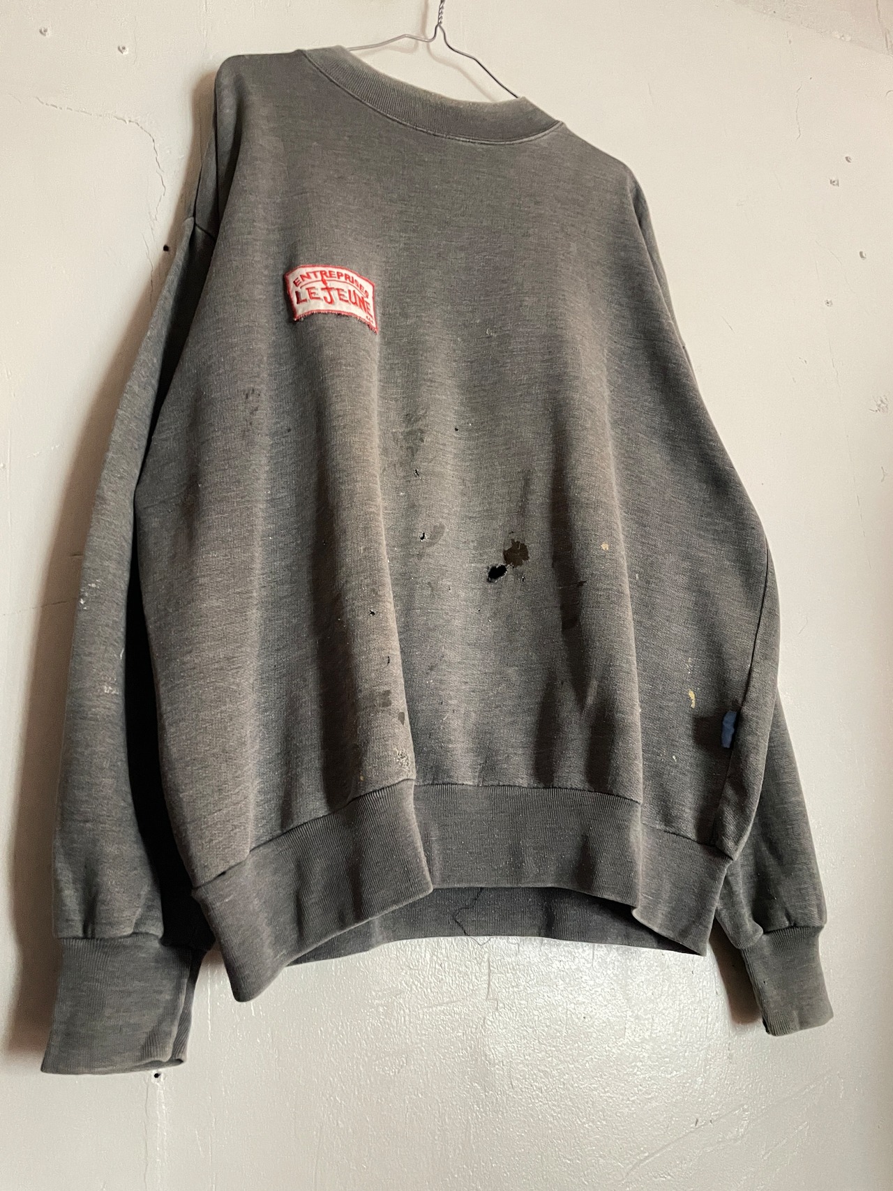 フェードしたグレーボディに、ダメージ×ペイントが施されたスウェット。ワンポイントで貼り付けられた企業ワッペンが良いアクセントになってくれてます。がっつりとやり過ぎてないダメージなどからセンスが感じられます。もはやデザインです。ゆったりめなサイズ感で、ファッションの取り入れる事によって良い抜け感を出してくれそうなアイテムです。