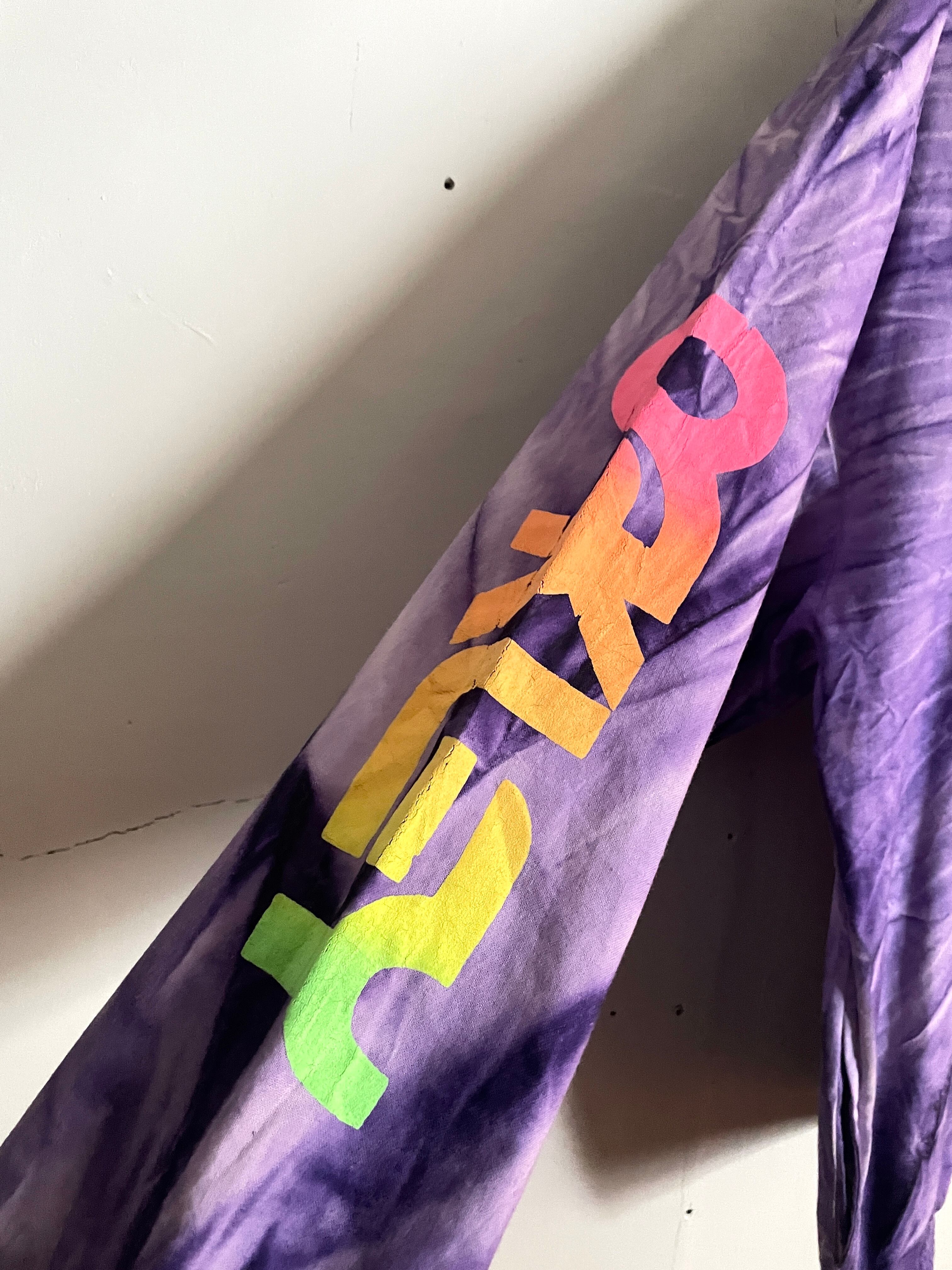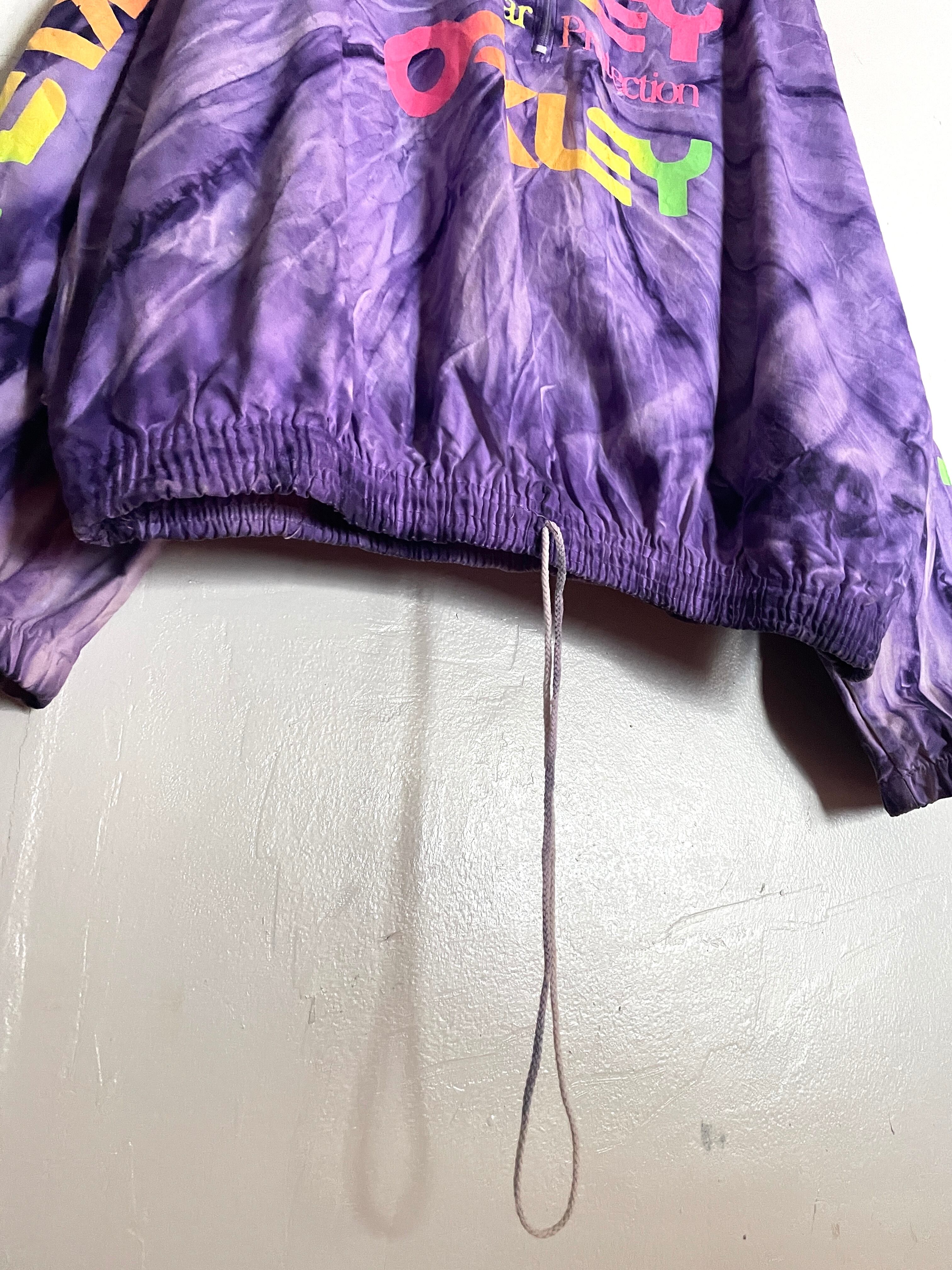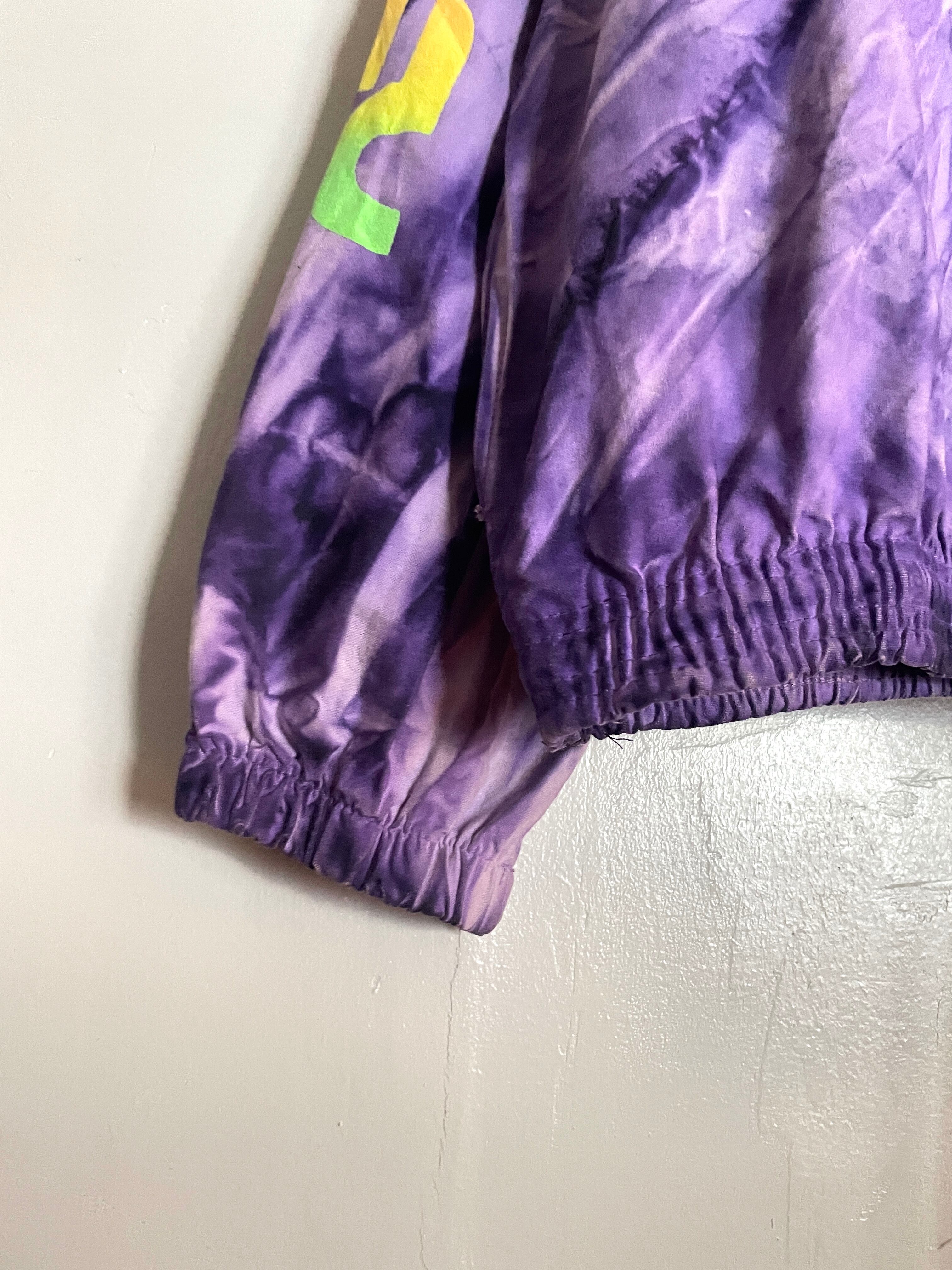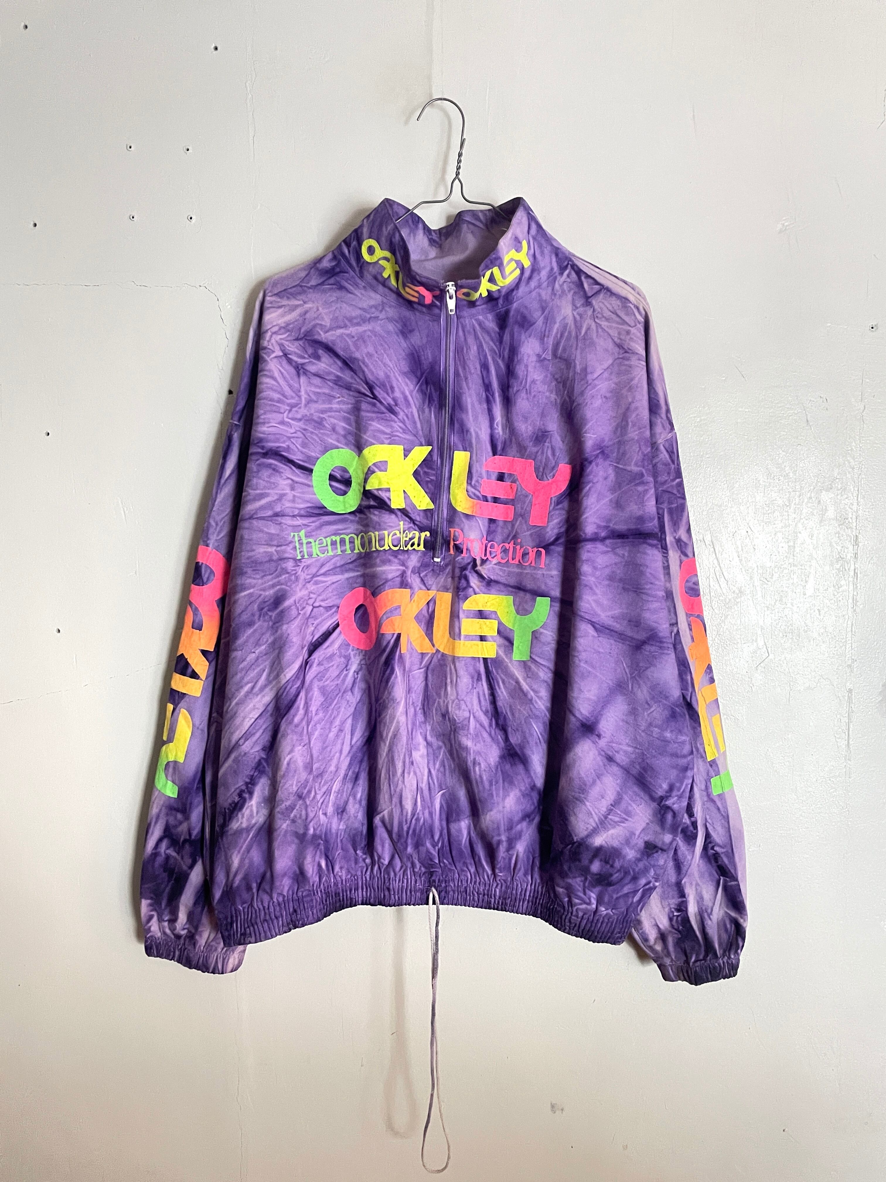 紫のタイダイボディに、カラフルな前と袖のプリントがお洒落なプルオーバージャケット。古着では度々見られる同じデザインのアイテム、「SURF STYLE」がベースとなっていて、おそらくオークリーがスポンサーとして付いた際のものだと思われます。近年ではストリートブランドやハイブランドもサンプリングしたことでも話題になりました。一枚ではもちろん、アウターのインナーとしても使える、個性的で便利なアイテムです。
