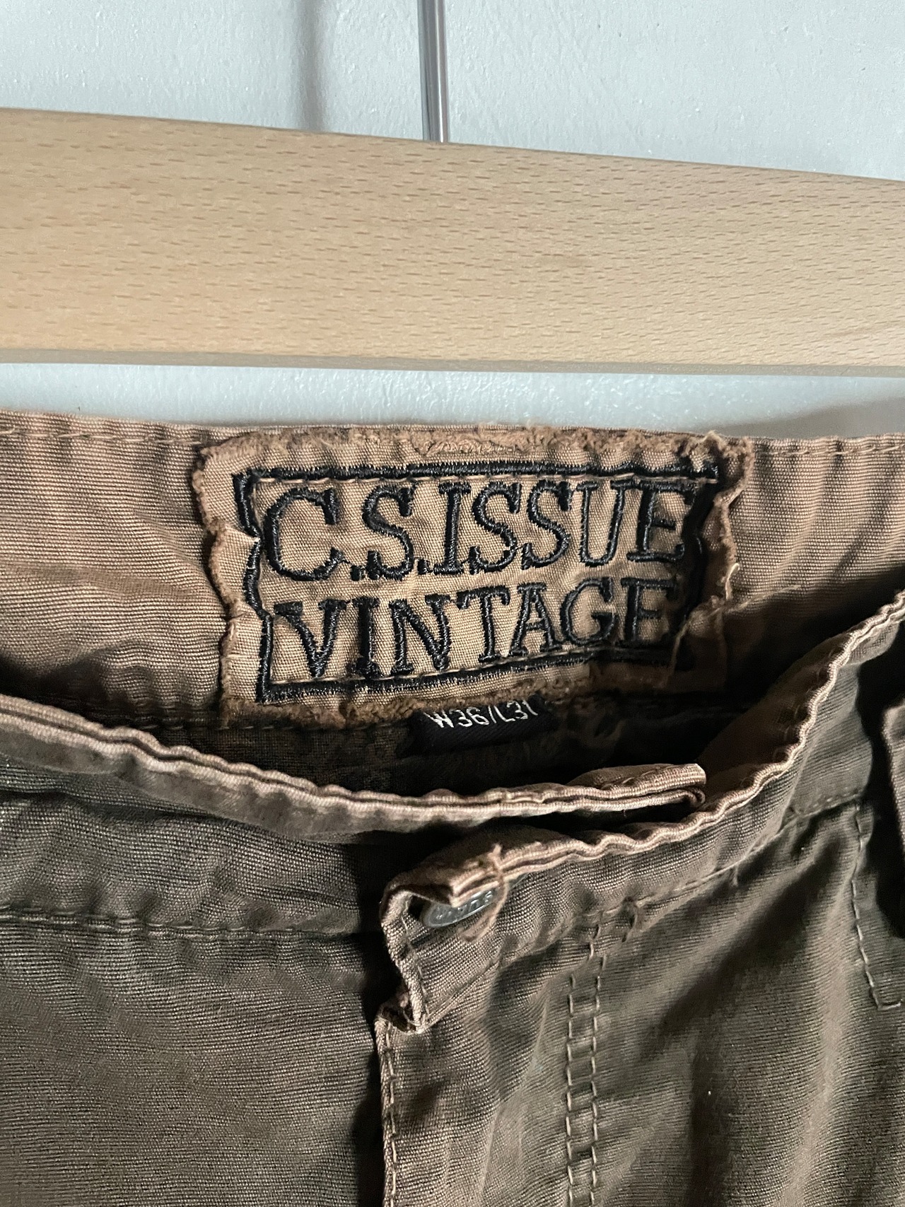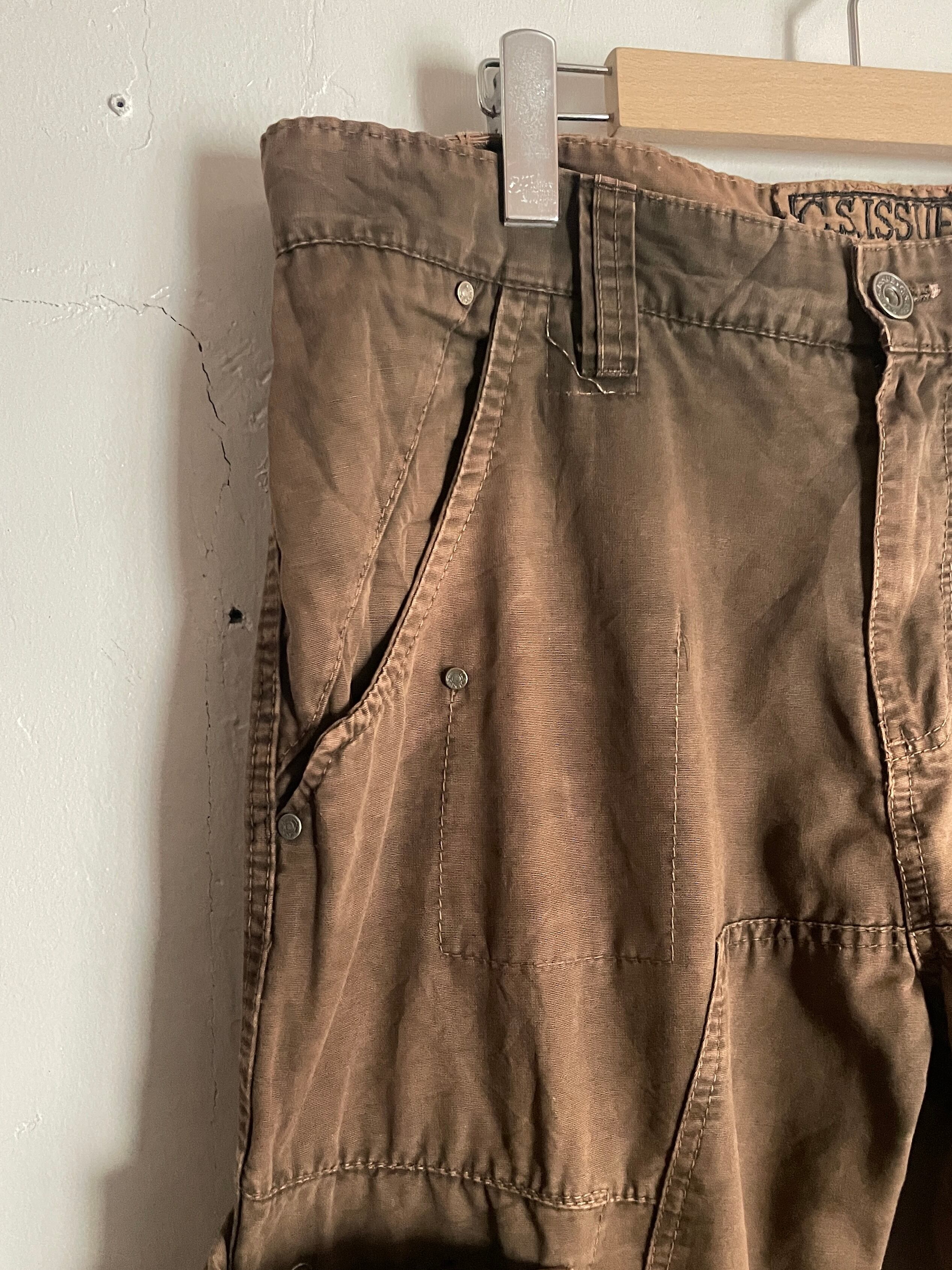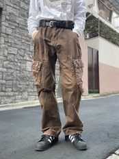 やや褪せた濃いめのブラウンで、ポケットのデザインが特徴的なカーゴパンツ。サイドポケットはフラップをめくるともう一つポケットが付いています。バックポケットは右側だけ玉淵ポケットも付いていて、たくさん収納できる機能性に富んでいます。部分的な切り替えデザインもお洒落なかっこいい一本。