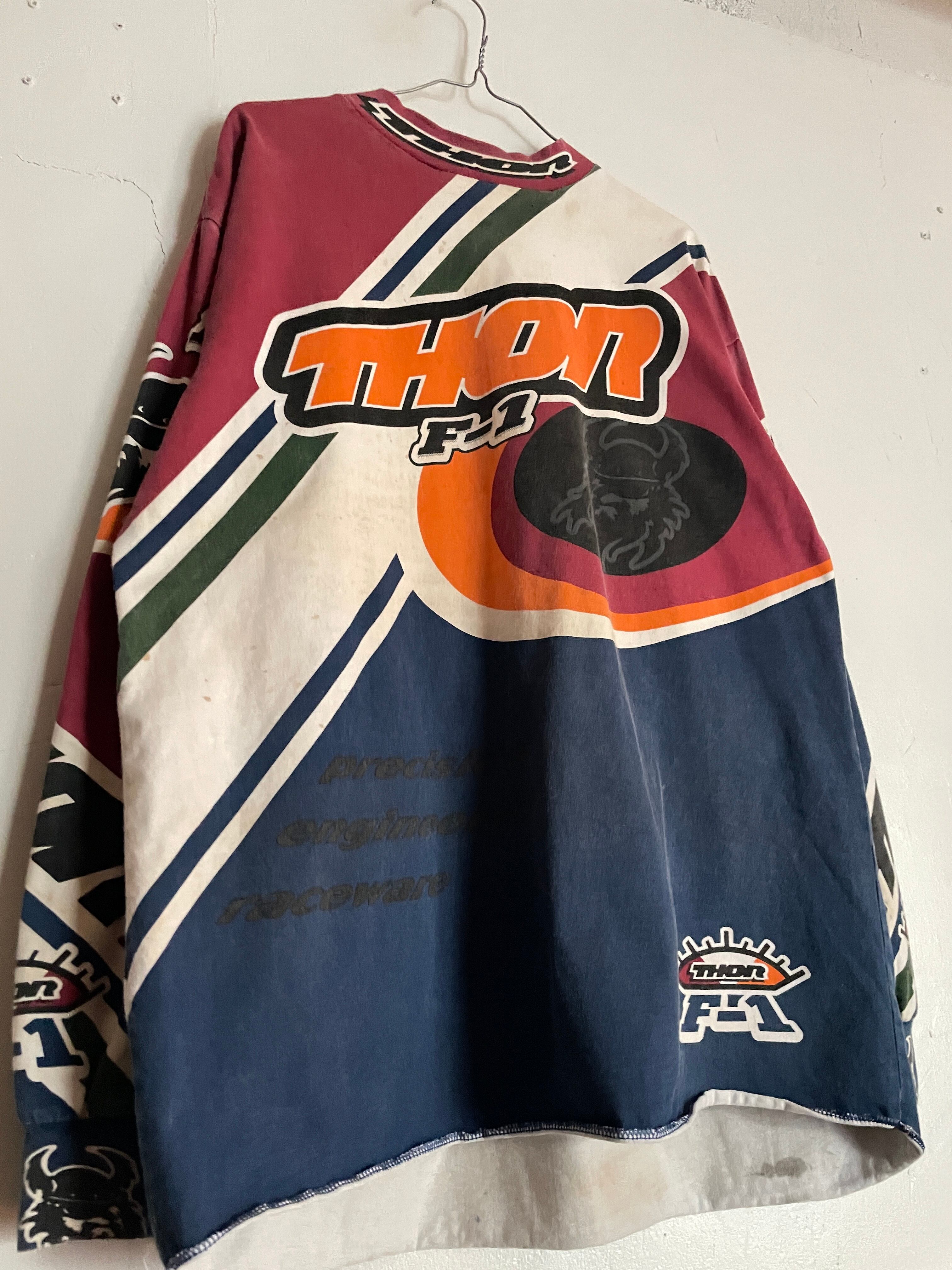 お洒落なマルチカラーで構成されたボディで、レーシング調のプリントが施されたモックネックTシャツ。全体に”THOR F-1"のプリントとキャラクタープリントなどがびっしりプリントされたインパクト大のデザイン。汚れなどが見られますが、これもまたデザインのように感じます。ゆったりとしたビッグサイズで、男性の方はもちろん、女性の方も大きめで着ると可愛らしいかと思います。