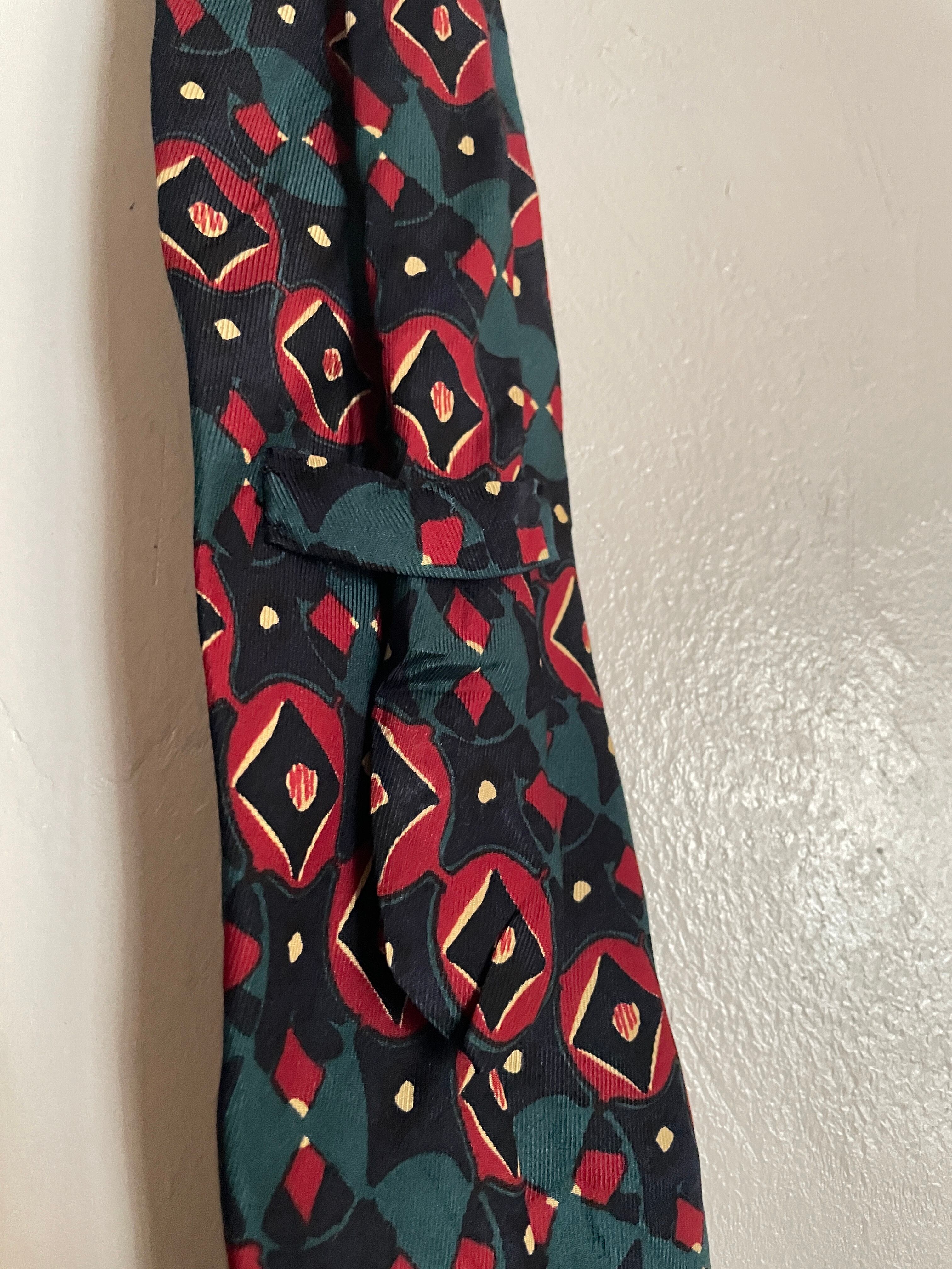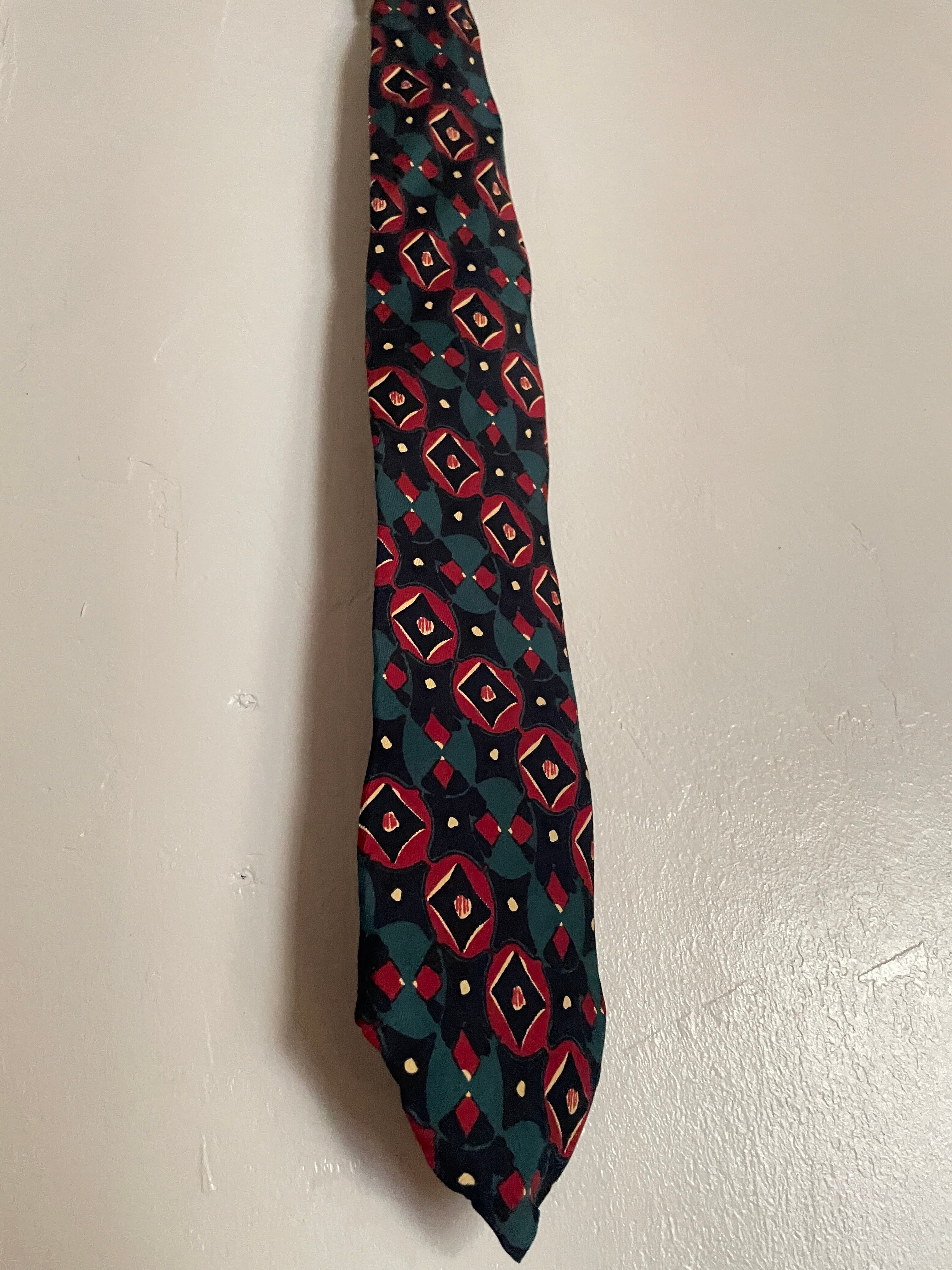 色気のあるグリーンカラーに、アート感のある菱形状の模様がデザインされた、バーバリーのネクタイ。良い意味でバーバリーっぽくないデザインなのがグッドです。太さも丁度良く、ファッションの良いアクセントになってくれる一本です。しっかりとUSA製なのもポイントが高いです。