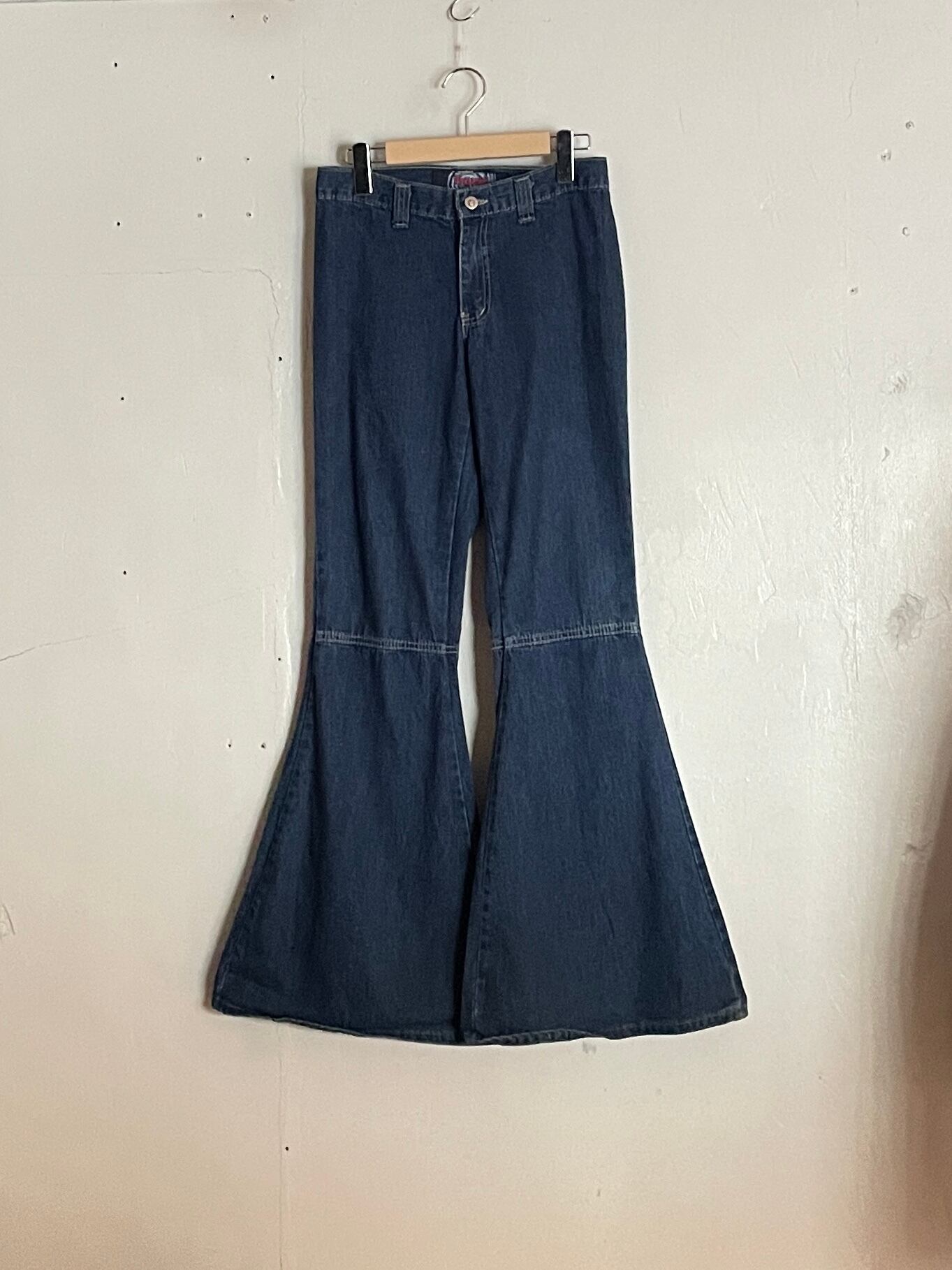 インディゴカラーで、70年代を感じさせる絶妙なシルエットが魅力的な、ベルボトムデニムパンツ。膝辺りから切り替えが入っていて、まさにベルの様な開きのシルエット。シューズが隠れる程の裾幅になっています。間違いなく雰囲気のある、ファッションのメインになってくれる一本です。