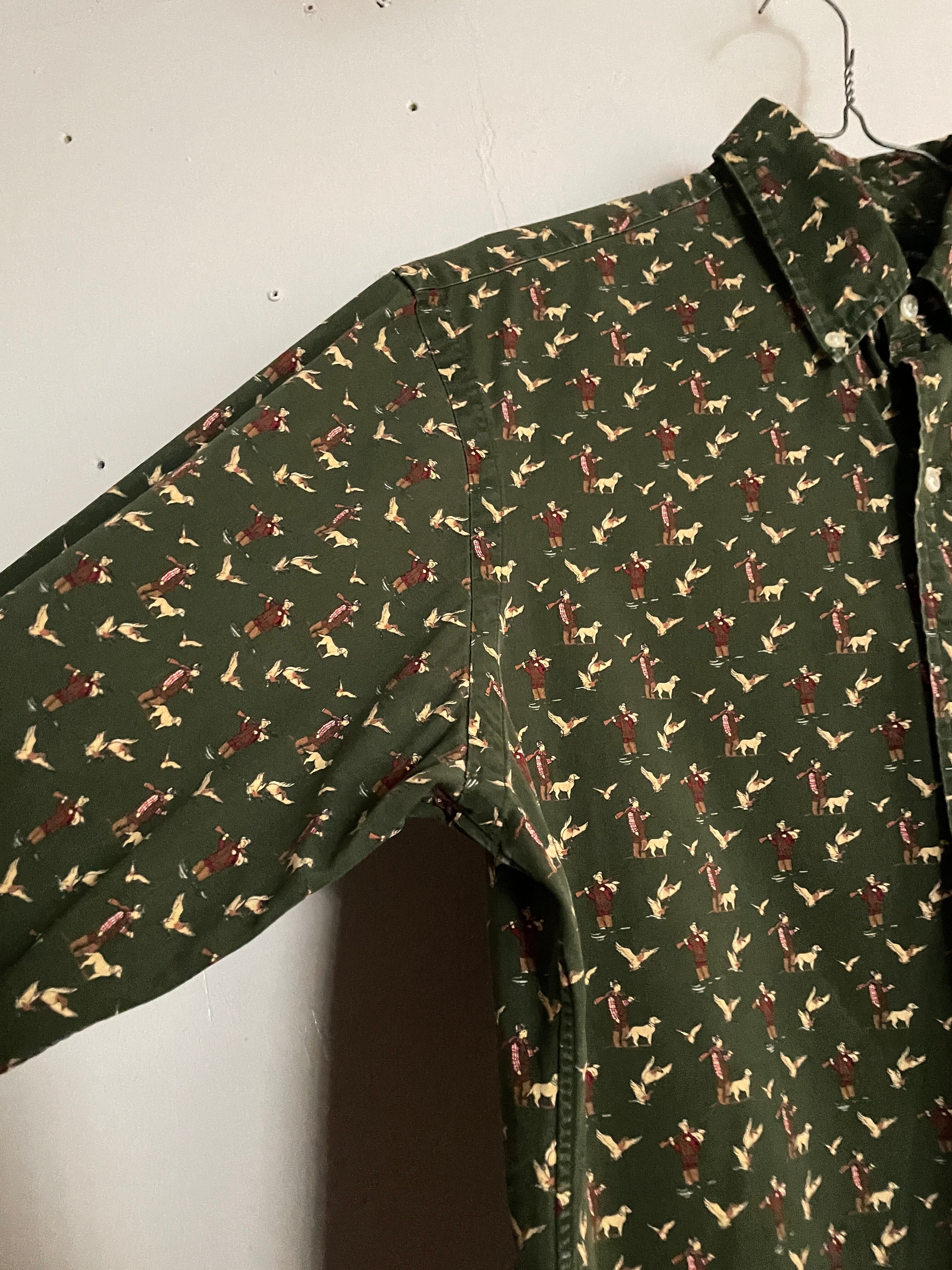 グリーンボディに、猟師と犬や鳥などが全体にデザインされた、ラルフローレンのコットンシャツ。さすがラルフといった、遊び心の感じられるお洒落なデザインです。着丈長めの綺麗な縦長シルエットです。今の時期にはインナーとしても活躍してくれそうです。春には一枚でファッションの主役になってくれるアイテムです。